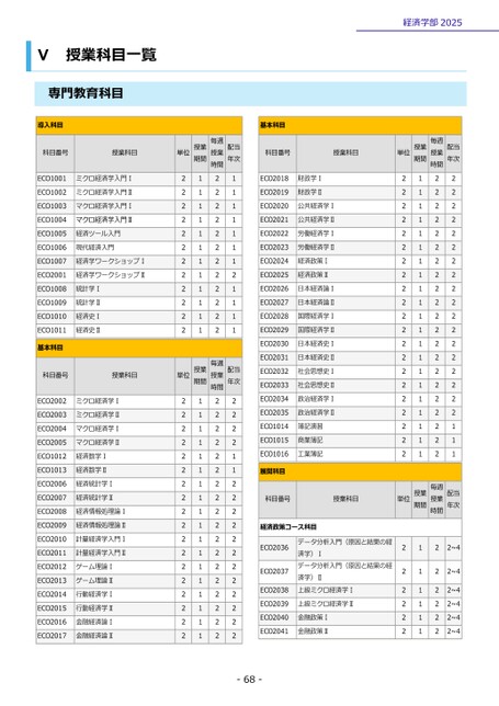 -68-経済学部2025Ⅴ授業科目一覧専門教育科目導入科目科目番号授業科目単位期間授業時間毎週授業年次配当ECO1001ミクロ経済学入門Ⅰ2121ECO1002ミクロ経済学入門Ⅱ2121ECO1003マクロ経済学入門Ⅰ2121ECO1004マクロ経済学入門Ⅱ2121ECO1005経済ツール入門2121ECO1006現代経済入門2121ECO1007経済学ワークショップⅠ2121ECO2001経済学ワークショップⅡ2122ECO1008統計学Ⅰ2121ECO1009統計学Ⅱ2121ECO1010経済史Ⅰ2121ECO1011経済史Ⅱ2121基本科目科目番号授業科目単位授業期間授業毎週時間配当年次ECO2002ミクロ経済学Ⅰ2122ECO2003ミクロ経済学Ⅱ2122ECO2004マクロ経済学Ⅰ2122ECO2005マクロ経済学Ⅱ2122ECO1012経済数学Ⅰ2121ECO1013経済数学Ⅱ2121ECO2006経済統計学Ⅰ2122ECO2007経済統計学Ⅱ2122ECO2008経済情報処理論Ⅰ2122ECO2009経済情報処理論Ⅱ2122ECO2010計量経済学入門Ⅰ2122ECO2011計量経済学入門Ⅱ2122ECO2012ゲーム理論Ⅰ2122ECO2013ゲーム理論Ⅱ2122ECO2014行動経済学Ⅰ2122ECO2015行動経済学Ⅱ2122ECO2016金融経済論Ⅰ2122ECO2017金融経済論Ⅱ2122基本科目科目番号授業科目単位期間授業時間毎週授業年次配当ECO2018財政学Ⅰ2122ECO2019財政学Ⅱ2122ECO2020公共経済学Ⅰ2122ECO2021公共経済学Ⅱ2122ECO2022労働経済学Ⅰ2122ECO2023労働経済学Ⅱ2122ECO2024経済政策Ⅰ2122ECO2025経済政策Ⅱ2122ECO2026日本経済論Ⅰ2122ECO2027日本経済論Ⅱ2122ECO2028国際経済学Ⅰ2122ECO2029国際経済学Ⅱ2122ECO2030日本経済史Ⅰ2122ECO2031日本経済史Ⅱ2122ECO2032社会思想史Ⅰ2122ECO2033社会思想史Ⅱ2122ECO2034政治経済学Ⅰ2122ECO2035政治経済学Ⅱ2122ECO1014簿記演習2121ECO1015商業簿記2121ECO1016工業簿記2121展開科目科目番号授業科目単位授業期間授業毎週時間配当年次経済政策コース科目ECO2036済学)Ⅱ済学)Ⅰデータ分析入門(原因と結果の経データ分析入門(原因と結果の経上級ミクロ経済学Ⅰ2122~4ECO20372122~4ECO20382122~4ECO2039上級ミクロ経済学Ⅱ2122~4ECO2040金融政策Ⅰ2122~4ECO2041金融政策Ⅱ2122~4