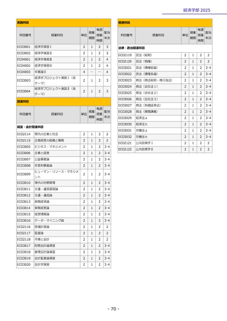 経済学部2025単位授業期間毎週授業時間配当年次222222222222222211111111111111112222222222222222223・43・43・43・43・43・43・43・43・43・43・43・422関連科目科目番号授業科目法律・政治関連科目ECO2119民法(総則)ECO2120民法(物権)ECO3021民法(債権総論)ECO3022民法(債権各論)ECO3023商法(商法総則・商行為法)ECO3024商法(会社法1)ECO3025商法(会社法2)ECO3026商法(会社法3)ECO3027商法(有価証券法)ECO3028商法(展開講義)単位授業期間毎週授業時間配当年次222242211112222――11223344433単位授業期間毎週授業時間配当年次ECO3029ECO3030ECO3031ECO3032経済法a経済法b労働法a労働法bECO2121公共政策学ⅠECO2122公共政策学Ⅱ222222222222222222222111111111111111111111222222222222222222222223・43・43・43・43・43・43・43・43・43・43・43・42223・43・43・43・4実践科目科目番号授業科目ECO3001経済学演習ⅠECO3002経済学演習ⅡECO4001経済学演習ⅢECO4002経済学演習Ⅳ卒業論文経済学プロジェクト演習Ⅰ(各テーマ)経済学プロジェクト演習Ⅱ(各テーマ)ECO4003ECO3003ECO3004関連科目科目番号授業科目経営・会計関連科目ECO2114現代の企業と社会ECO2115企業経営の組織と戦略ECO3005ビジネス・マネジメントECO3006企業と経営ECO3007公益事業論ECO3008ECO3009ECO3010非営利事業論ヒューマン・リソース・マネジメント現代の労務管理ECO3011交通・通信基礎論ECO3012交通・通信論ECO3013保険経済論ECO3014保険経営論ECO3015経営情報論ECO3016データ・マイニング論ECO2116原価計算論ECO2117監査論ECO2118市場と会計ECO3017財務会計論演習ECO3018管理会計論演習ECO3019会計監査論演習ECO3020会計学演習-70-