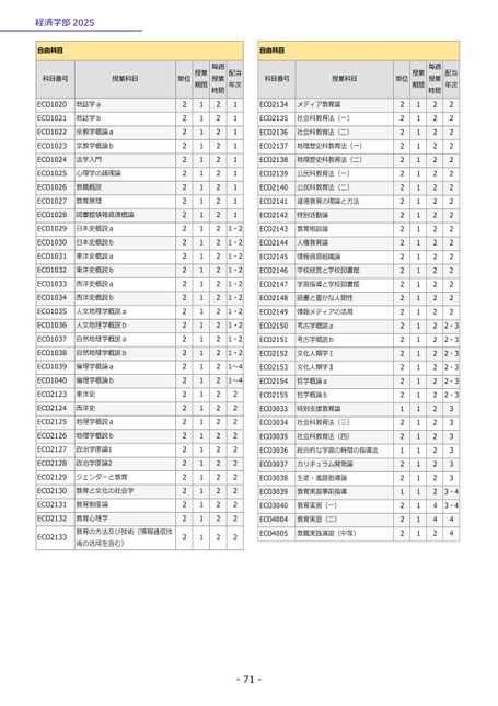 経済学部2025-71-自由科目科目番号授業科目単位授業期間授業毎週時間配当年次ECO1020地誌学a2121ECO1021地誌学b2121ECO1022宗教学概論a2121ECO1023宗教学概論b2121ECO1024法学入門2121ECO1025心理学の諸理論2121ECO1026教職概説2121ECO1027教育原理2121ECO1028図書館情報資源概論2121ECO1029日本史概説a2121・2ECO1030日本史概説b2121・2ECO1031東洋史概説a2121・2ECO1032東洋史概説b2121・2ECO1033西洋史概説a2121・2ECO1034西洋史概説b2121・2ECO1035人文地理学概説a2121・2ECO1036人文地理学概説b2121・2ECO1037自然地理学概説a2121・2ECO1038自然地理学概説b2121・2ECO1039倫理学概論a2121~4ECO1040倫理学概論b2121~4ECO2123東洋史2122ECO2124西洋史2122ECO2125地理学概説a2122ECO2126地理学概説b2122ECO2127政治学原論12122ECO2128政治学原論22122ECO2129ジェンダーと教育2122ECO2130教育と文化の社会学2122ECO2131教育制度論2122ECO2132術の活用を含む)教育心理学教育の方法及び技術(情報通信技2122ECO21332122自由科目科目番号授業科目単位授業期間授業毎週時間配当年次ECO2134メディア教育論2122ECO2135社会科教育法(一)2122ECO2136社会科教育法(二)2122ECO2137地理歴史科教育法(一)2122ECO2138地理歴史科教育法(二)2122ECO2139公民科教育法(一)2122ECO2140公民科教育法(二)2122ECO2141道徳教育の理論と方法2122ECO2142特別活動論2122ECO2143教育相談論2122ECO2144人権教育論2122ECO2145情報資源組織論2122ECO2146学校経営と学校図書館2122ECO2147学習指導と学校図書館2122ECO2148読書と豊かな人間性2122ECO2149情報メディアの活用2122ECO2150考古学概説a2122・3ECO2151考古学概説b2122・3ECO2152文化人類学Ⅰ2122・3ECO2153文化人類学Ⅱ2122・3ECO2154哲学概論a2122・3ECO2155哲学概論b2122・3ECO3033特別支援教育論1123ECO3034社会科教育法(三)2123ECO3035社会科教育法(四)2123ECO3036総合的な学習の時間の指導法1123ECO3037カリキュラム開発論2123ECO3038生徒・進路指導論2123ECO3039教育実習事前指導1123・4ECO3040教育実習(一)2143・4ECO4004教育実習(二)2144ECO4005教職実践演習(中等)2124