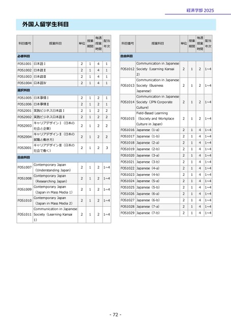 経済学部2025単位授業期間毎週授業時間配当年次22222222222222222211111111111111111121~421~421~42444444444444441~41~41~41~41~41~41~41~41~41~41~41~41~41~41~4外国人留学生科目科目番号授業科目必修科目FOS1001日本語ⅠFOS1002日本語ⅡFOS1003日本語ⅢFOS1004日本語Ⅳ選択科目FOS1005日本事情ⅠFOS1006日本事情ⅡFOS2001実践ビジネス日本語ⅠFOS2002FOS2003FOS2004FOS3001自由科目FOS1007FOS1008FOS1009FOS1010FOS1011実践ビジネス日本語ⅡキャリアデザインⅠ(日本の社会と企業)キャリアデザインⅡ(日本の就職と働き方)キャリアデザインⅢ(日本の社会で働く)ContemporaryJapan(UnderstandingJapan)ContemporaryJapan(ResearchingJapan)ContemporaryJapan(JapaninMassMedia1)ContemporaryJapan(JapaninMassMedia2)CommunicationinJapaneseSociety(LearningKansai1)単位授業期間毎週授業時間配当年次222222222222222211111111111111114444222222222222111111222231~41~41~41~41~4科目番号授業科目自由科目FOS1012FOS1013FOS1014FOS1015FOS1016CommunicationinJapaneseSociety(LearningKansai2)CommunicationinJapaneseSociety(BusinessJapanese)CommunicationinJapaneseSociety(JPNCorporateCulture)Field-BasedLearning(SocietyandWorkplaceCultureinJapan)Japanese(1-a)FOS1017Japanese(1-b)FOS1018Japanese(2-a)FOS1019Japanese(2-b)FOS1020Japanese(3-a)FOS1021Japanese(3-b)FOS1022Japanese(4-a)FOS1023Japanese(4-b)FOS1024Japanese(5-a)FOS1025Japanese(5-b)FOS1026Japanese(6-a)FOS1027Japanese(6-b)FOS1028Japanese(7-a)FOS1029Japanese(7-b)-72-