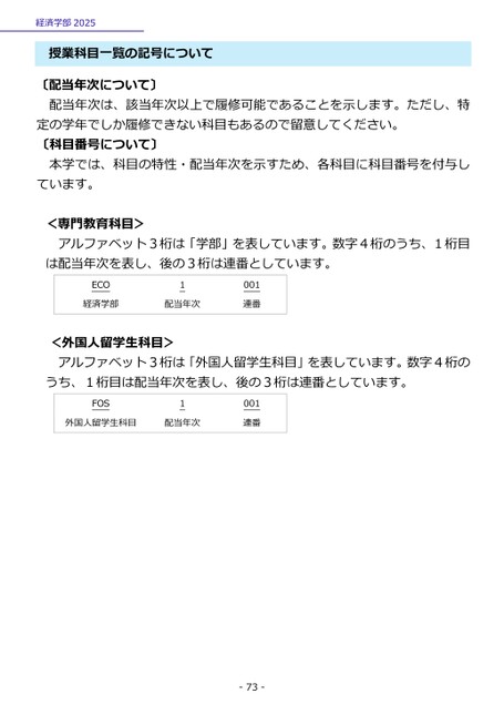 配当年次は、該当年次以上で履修可能であることを示します。ただし、特定の学年でしか履修できない科目もあるので留意してください。〔科目番号について〕本学では、科目の特性・配当年次を示すため、各科目に科目番号を付与しています。<専門教育科目>アルファベット3桁は「学部」を表しています。数字4桁のうち、1桁目は配当年次を表し、後の3桁は連番としています。外国人留学生科目>アルファベット3桁は「外国人留学生科目」を表しています。数字4桁の<うち、1桁目は配当年次を表し、後の3桁は連番としています。ECO経済学部1配当年次001連番経済学部2025授業科目一覧の記号について〔配当年次について〕FOS1外国人留学生科目配当年次001連番-73-