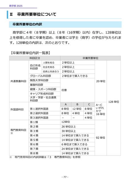 商学部2025Ⅱ卒業所要単位について卒業所要単位の内訳商学部に4年〈8学期〉以上(8年〈16学期〉以内)在学し、128単位以上を修得した者に卒業を認め、卒業者には学士(商学)の学位が与えられます。128単位の内訳は、次のとおりです。卒業所要単位2単位以上2単位以上2単位以上2単位まで算入できる20単位任意128単位A~Cいずれかで16単位92単位ABC8単位4単位4単位12単位4単位-8単位8単位-12単位26単位以上30単位以上14単位まで算入できる14単位まで算入できる6単位まで算入できる24単位まで算入できる14単位まで算入できる科目区分自己形成科目群人間を知る社会を知る自然と向き合う卒業所要単位内訳一覧表】【グローバル科目群関西大学科目群基盤科目群健康・スポーツ科目群キャリア形成科目群大学・学部・社会連携科目群第1選択外国語第2選択外国語第3選択外国語第1類第2類第3類第4類第5類第6類第7類第8類共通教養科目外国語科目専門教育科目※専門教育科目の内訳詳細は「3専門教育科目」を参照-77-※