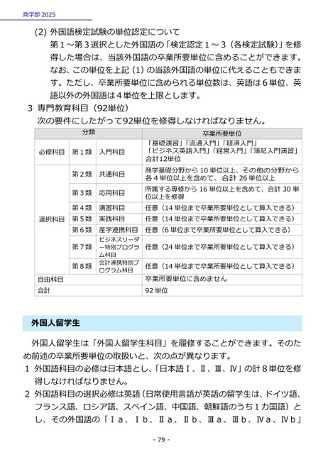 商学部2025(2)外国語検定試験の単位認定について第1~第3選択とした外国語の「検定認定1~3(各検定試験)」を修得した場合は、当該外国語の卒業所要単位に含めることができます。なお、この単位を上記(1)の当該外国語の単位に代えることもできます。ただし、卒業所要単位に含められる単位数は、英語は6単位、英語以外の外国語は4単位を上限とします。3専門教育科目(92単位)次の要件にしたがって92単位を修得しなければなりません。分類必修科目第1類入門科目選択科目第2類共通科目第3類応用科目第4類第5類第6類第7類第8類演習科目実践科目産学連携科目ビジネスリーダー特別プログラム科目会計連携特別プログラム科目自由科目合計外国人留学生卒業所要単位「基礎演習」「流通入門」「経済入門」「ビジネス英語入門」「経営入門」「簿記入門演習」合計12単位商学基礎分野から10単位以上、その他の分野から各4単位以上を含めて、合計26単位以上所属する専修から16単位以上を含めて、合計30単位以上を修得任意(14単位まで卒業所要単位として算入できる)任意(14単位まで卒業所要単位として算入できる)任意(6単位まで卒業所要単位として算入できる)任意(24単位まで卒業所要単位として算入できる)任意(14単位まで卒業所要単位として算入できる)卒業所要単位に含めません92単位外国人留学生は「外国人留学生科目」を履修することができます。そのため前述の卒業所要単位の取扱いと、次の点が異なります。1外国語科目の必修は日本語とし、「日本語Ⅰ、Ⅱ、Ⅲ、Ⅳ」の計8単位を修得しなければなりません。2外国語科目の選択必修は英語(日常使用言語が英語の留学生は、ドイツ語、フランス語、ロシア語、スペイン語、中国語、朝鮮語のうち1カ国語)とし、その外国語の「Ⅰa、Ⅰb、Ⅱa、Ⅱb、Ⅲa、Ⅲb、Ⅳa、Ⅳb」-79-