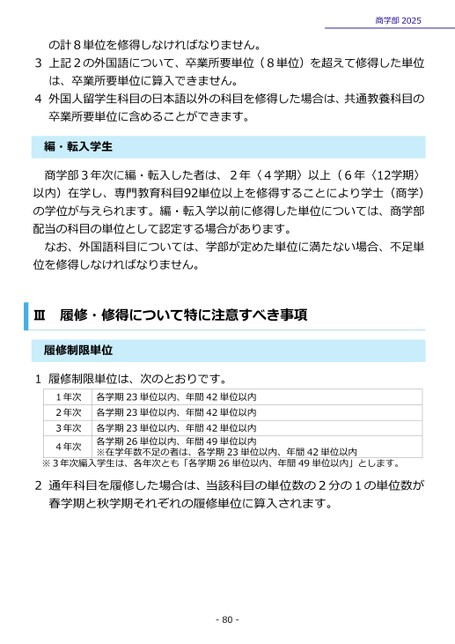 商学部2025の計8単位を修得しなければなりません。3上記2の外国語について、卒業所要単位(8単位)を超えて修得した単位は、卒業所要単位に算入できません。4外国人留学生科目の日本語以外の科目を修得した場合は、共通教養科目の卒業所要単位に含めることができます。編・転入学生商学部3年次に編・転入した者は、2年〈4学期〉以上(6年〈12学期〉以内)在学し、専門教育科目92単位以上を修得することにより学士(商学)の学位が与えられます。編・転入学以前に修得した単位については、商学部配当の科目の単位として認定する場合があります。なお、外国語科目については、学部が定めた単位に満たない場合、不足単位を修得しなければなりません。履修・修得について特に注意すべき事項Ⅲ履修制限単位1履修制限単位は、次のとおりです。1年次2年次3年次4年次各学期23単位以内、年間42単位以内各学期23単位以内、年間42単位以内各学期23単位以内、年間42単位以内各学期26単位以内、年間49単位以内※在学年数不足の者は、各学期23単位以内、年間42単位以内※3年次編入学生は、各年次とも「各学期26単位以内、年間49単位以内」とします。2通年科目を履修した場合は、当該科目の単位数の2分の1の単位数が春学期と秋学期それぞれの履修単位に算入されます。-80-