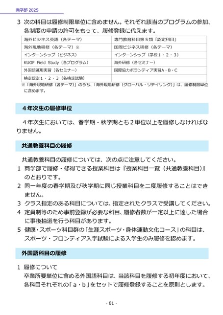 商学部20253次の科目は履修制限単位に含めません。それぞれ該当のプログラムの参加、各制度の申請の許可をもって、履修登録に代えます。海外ビジネス英語(各テーマ)専門教育科目第5類「認定科目」海外現地研修(各テーマ)※インターンシップ(ビジネス)KUGFFieldStudy(各プログラム)外国語運用実習(各セミナー)国際ビジネス研修(各テーマ)インターンシップ(学校1・2・3)海外研修(各セミナー)国際協力ボランティア実習A・B・C検定認定1・2・3(各検定試験)※「海外現地研修(各テーマ)」のうち、「海外現地研修(グローバル・リテイリング)」は、履修制限単位年次生の履修単位4に含めます。4年次生においては、春学期・秋学期とも2単位以上を履修しなければなりません。共通教養科目の履修共通教養科目の履修については、次の点に注意してください。1商学部で履修・修得できる授業科目は『授業科目一覧(共通教養科目)』のとおりです。2同一年度の春学期及び秋学期に同じ授業科目を二度履修することはできません。3クラス指定のある科目については、指定されたクラスで受講してください。4定員制等のため事前登録が必要な科目、履修者数が一定以上に達した場合に事後抽選を行う科目があります。5健康・スポーツ科目群の「生涯スポーツ・身体運動文化コース」の科目は、スポーツ・フロンティア入学試験による入学生のみ履修を認めます。外国語科目の履修1履修について卒業所要単位に含める外国語科目は、当該科目を履修する初年度において、各科目それぞれの「a・b」をセットで履修登録することを原則とします。-81-
