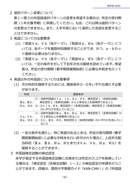 2選択パターン変更について商学部2025第1~第3の外国語選択パターンの変更を希望する場合は、所定の受付期間(1年次春学期)に申請してください。なお、これ以降は選択パターンの変更はできません。また、入学手続において選択した言語を変更することはできません。3英語についての注意事項(1)「英語Ⅴa、Ⅴb(各テーマ)」、「英語Ⅵa、Ⅵb(各テーマ)」については、各テーマを複数科目履修することができ、かつ、a・bセット履修の必要はありません。(2)「英語Ⅴa、Ⅴb(各テーマ)」、「英語Ⅵa、Ⅵb(各テーマ)」については、一定の条件を付して下位年次生の履修を認めています。希望者は、所定の受付期間(春学期授業開始前)に必要な手続きを行ってください。4英語以外の外国語についての注意事項(1)次の科目を履修するためには、履修条件①・②をいずれも満たす必要があります。科目Ⅲa、Ⅲb、Ⅳa、ⅣbⅤa、Ⅴb、Ⅵa、Ⅵb履修条件①:当該外国語のⅠa、Ⅰb、Ⅱa、Ⅱb、検定認定1(各検定試験)、検定認定2(各検定試験)から2単位以上を修得済であること②:①にⅠb、Ⅱb、検定認定1(各検定試験)、検定認定2(各検定試験)のいずれかを含んでいること①:当該外国語のⅢa、Ⅲb、Ⅳa、Ⅳb、検定認定2(各検定試験)から2単位以上を修得済であること②:①に、Ⅲb、Ⅳb、検定認定2(各検定試験)のいずれかを含んでいること(2)一定の条件を満たし、特に希望のあるときは、所定の受付期間(春学期授業開始前)に必要な手続きを行い許可された場合に、上位年次配当科目(Ⅲa、Ⅲb、Ⅳa、ⅣbまたはⅤa、Ⅴb、Ⅵa、Ⅵb)を履修することができます。5外国語検定試験の単位認定本学が指定する外国語検定試験に合格または所定のスコアを取得している場合は、「検定認定(各検定試験)1~3」の単位認定の申請を行うことができます。詳細は、関西大学教務ガイド「KAN-CAN!」の『外国語-82-