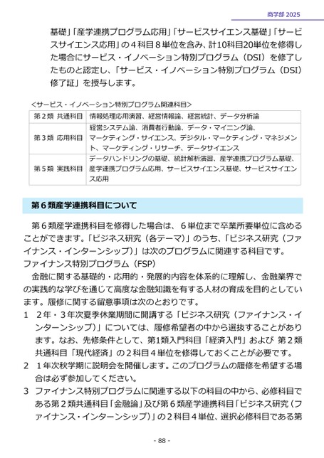 商学部2025基礎」「産学連携プログラム応用」「サービスサイエンス基礎」「サービスサイエンス応用」の4科目8単位を含み、計10科目20単位を修得した場合にサービス・イノベーション特別プログラム(DSI)を修了したものと認定し、「サービス・イノベーション特別プログラム(DSI)修了証」を授与します。第3類応用科目第5類実践科目情報処理応用演習、経営情報論、経営統計、データ分析論経営システム論、消費者行動論、データ・マイニング論、マーケティング・サイエンス、デジタル・マーケティング・マネジメント、マーケティング・リサーチ、データサイエンスデータハンドリングの基礎、統計解析演習、産学連携プログラム基礎、産学連携プログラム応用、サービスサイエンス基礎、サービスサイエンス応用サービス・イノベーション特別プログラム関連科目>第2類共通科目<第6類産学連携科目について第6類産学連携科目を修得した場合は、6単位まで卒業所要単位に含めることができます。「ビジネス研究(各テーマ)」のうち、「ビジネス研究(ファイナンス・インターンシップ)」は次のプログラムに関連する科目です。ファイナンス特別プログラム(FSP)金融に関する基礎的・応用的・発展的内容を体系的に理解し、金融業界での実践的な学びを通じて高度な金融知識を有する人材の育成を目的としています。履修に関する留意事項は次のとおりです。12年・3年次夏季休業期間に開講する「ビジネス研究(ファイナンス・インターンシップ)」については、履修希望者の中から選抜することがあります。なお、先修条件として、第1類入門科目「経済入門」および第2類共通科目「現代経済」の2科目4単位を修得しておくことが必要です。21年次秋学期に説明会を開催します。このプログラムの履修を希望する場合は必ず参加してください。3ファイナンス特別プログラムに関連する以下の科目の中から、必修科目である第2類共通科目「金融論」及び第6類産学連携科目「ビジネス研究(ファイナンス・インターンシップ)」の2科目4単位、選択必修科目である第-88-