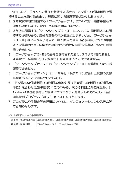 商学部2025なお、本プログラムへの参加を希望する場合は、第5類ALSP関連科目を履修することを強く勧めます。履修に関する留意事項は次のとおりです。12年次秋学期に開講する「ワークショップⅠ」については、履修希望者の中から選抜します。なお、先修条件はありません。23年次に開講する「ワークショップⅡ・Ⅲ」については、両科目ともに履修する必要があり、履修希望者の中から選抜します。なお、「ワークショップⅡ・Ⅲ」は2年次終了時点で、第1類入門科目(必修科目)から10単位以上を修得のうえ、卒業所要単位のうち合計60単位を修得済でなければ履修できません。3「ワークショップⅡ・Ⅲ」の履修を許可された者は、3年次で「専門演習」、4年次で「卒業研究」「研究論文」を履修することはできません。4「ワークショップⅣ・Ⅴ」は「ワークショップⅡ・Ⅲ」を修得しなければ履修できません。5「ワークショップⅣ・Ⅴ」は、日商簿記1級または公認会計士試験の受験6経験があることを履修要件とします。第5類ALSP関連科目(16科目32単位)及び第8類ALSP科目(10科目20単位)を合わせた26科目52単位の中から、次の6科目12単位を含み、計12科目24単位を修得した場合に本プログラムを修了したものとし、「会計連携特別プログラム(ALSP)修了証」を授与します。7プログラムや手続き等の詳細については、インフォメーションシステム等でお知らせします。ALSP修了のための必修科目>第5類ALSP関連科目第8類ALSP科目上級簿記演習Ⅰ、上級簿記演習Ⅱ、上級簿記演習Ⅲ、上級簿記演習ⅣワークショップⅡ、ワークショップⅢ-91-<