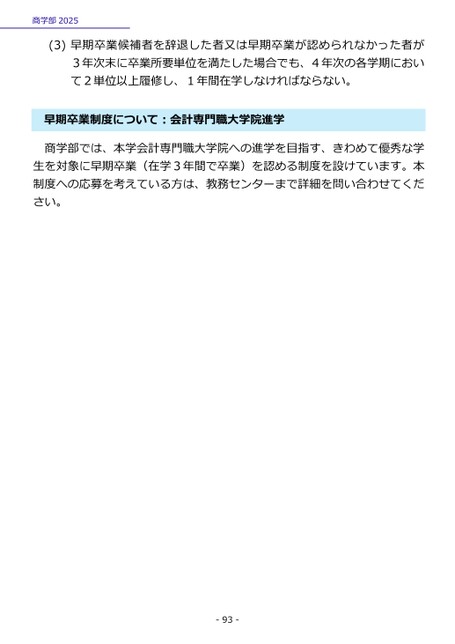 商学部2025(3)早期卒業候補者を辞退した者又は早期卒業が認められなかった者が3年次末に卒業所要単位を満たした場合でも、4年次の各学期において2単位以上履修し、1年間在学しなければならない。早期卒業制度について:会計専門職大学院進学商学部では、本学会計専門職大学院への進学を目指す、きわめて優秀な学生を対象に早期卒業(在学3年間で卒業)を認める制度を設けています。本制度への応募を考えている方は、教務センターまで詳細を問い合わせてください。-93-