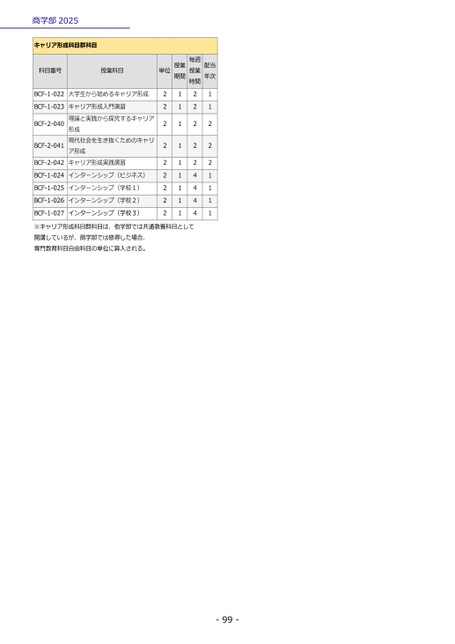 -99-商学部2025キャリア形成科目群科目科目番号授業科目単位授業期間毎週授業時間配当年次BCF-1-022大学生から始めるキャリア形成BCF-1-023BCF-2-040BCF-2-041BCF-2-042キャリア形成入門演習理論と実践から探究するキャリア形成現代社会を生き抜くためのキャリア形成キャリア形成実践演習BCF-1-024インターンシップ(ビジネス)BCF-1-025インターンシップ(学校1)BCF-1-026インターンシップ(学校2)BCF-1-027インターンシップ(学校3)222222222111111111222224444112221111※キャリア形成科目群科目は、他学部では共通教養科目として開講しているが、商学部では修得した場合、専門教育科目自由科目の単位に算入される。