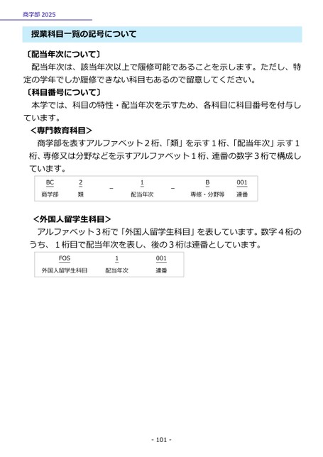 商学部2025授業科目一覧の記号について〔配当年次について〕配当年次は、該当年次以上で履修可能であることを示します。ただし、特定の学年でしか履修できない科目もあるので留意してください。〔科目番号について〕本学では、科目の特性・配当年次を示すため、各科目に科目番号を付与しています。<専門教育科目>商学部を表すアルファベット2桁、「類」を示す1桁、「配当年次」示す1桁、専修又は分野などを示すアルファベット1桁、連番の数字3桁で構成しています。BC商学部2類-1配当年次-B専修・分野等001連番<外国人留学生科目>アルファベット3桁で「外国人留学生科目」を表しています。数字4桁のうち、1桁目で配当年次を表し、後の3桁は連番としています。FOS1外国人留学生科目配当年次001連番-101-
