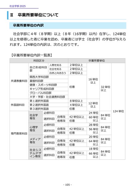 124単位84単位以上84単位以上84単位以上84単位以上32単位以上卒業所要単位16単位以上12単位以上24単位60単位以上28単位56単位以上20単位64単位以上18単位66単位以上社会学部2025Ⅱ卒業所要単位について卒業所要単位の内訳社会学部に4年〈8学期〉以上(8年〈16学期〉以内)在学し、124単位以上を修得した者に卒業を認め、卒業者には学士(社会学)の学位が与えられます。124単位の内訳は、次のとおりです。【卒業所要単位内訳一覧表】科目区分自己形成科目群人間を知る社会を知る自然と向き合う関西大学科目群基盤科目群健康・スポーツ科目群キャリア形成科目群グローバル科目群大学・学部・社会連携科目群第1選択外国語第2選択外国語第3選択外国語社会学専攻心理学専攻メディア専攻社会システムデザイン専攻必修科目選択科目必修科目選択科目必修科目選択科目必修科目選択科目2単位以上2単位以上2単位以上任意8単位以上4単位以上任意自専攻他専攻42単位以上任意自専攻他専攻42単位以上任意自専攻他専攻42単位以上任意自専攻他専攻42単位以上任意-105-共通教養科目外国語科目専門教育科目