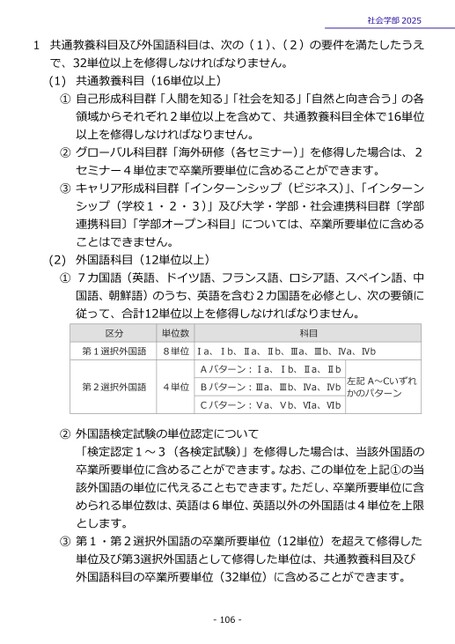 社会学部2025共通教養科目及び外国語科目は、次の(1)、(2)の要件を満たしたうえで、32単位以上を修得しなければなりません。(1)共通教養科目(16単位以上)①自己形成科目群「人間を知る」「社会を知る」「自然と向き合う」の各領域からそれぞれ2単位以上を含めて、共通教養科目全体で16単位以上を修得しなければなりません。②グローバル科目群「海外研修(各セミナー)」を修得した場合は、2セミナー4単位まで卒業所要単位に含めることができます。③キャリア形成科目群「インターンシップ(ビジネス)」、「インターンシップ(学校1・2・3)」及び大学・学部・社会連携科目群〔学部連携科目〕「学部オープン科目」については、卒業所要単位に含めることはできません。外国語科目(12単位以上)(2)①7カ国語(英語、ドイツ語、フランス語、ロシア語、スペイン語、中国語、朝鮮語)のうち、英語を含む2カ国語を必修とし、次の要領に従って、合計12単位以上を修得しなければなりません。区分単位数科目第1選択外国語8単位Ⅰa、Ⅰb、Ⅱa、Ⅱb、Ⅲa、Ⅲb、Ⅳa、Ⅳb第2選択外国語4単位Bパターン:Ⅲa、Ⅲb、Ⅳa、ⅣbAパターン:Ⅰa、Ⅰb、Ⅱa、ⅡbCパターン:Ⅴa、Ⅴb、Ⅵa、Ⅵb左記A~Ⅽいずれかのパターン外国語検定試験の単位認定について「検定認定1~3(各検定試験)」を修得した場合は、当該外国語の卒業所要単位に含めることができます。なお、この単位を上記①の当該外国語の単位に代えることもできます。ただし、卒業所要単位に含められる単位数は、英語は6単位、英語以外の外国語は4単位を上限とします。②③第1・第2選択外国語の卒業所要単位(12単位)を超えて修得した単位及び第3選択外国語として修得した単位は、共通教養科目及び外国語科目の卒業所要単位(32単位)に含めることができます。1-106-