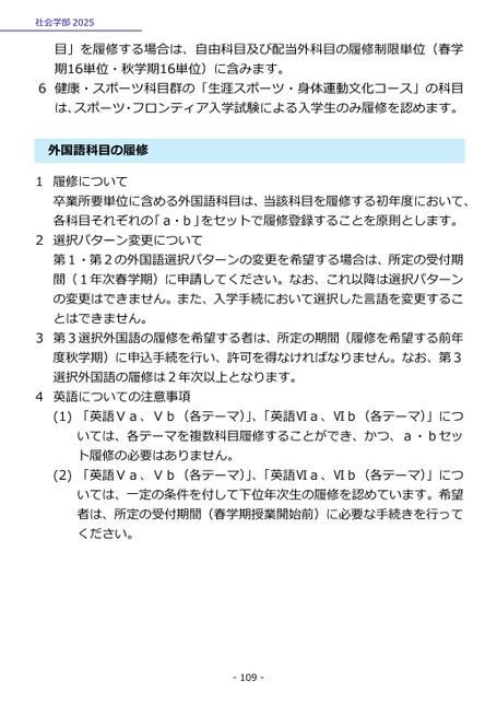 社会学部2025目」を履修する場合は、自由科目及び配当外科目の履修制限単位(春学期16単位・秋学期16単位)に含みます。6健康・スポーツ科目群の「生涯スポーツ・身体運動文化コース」の科目は、スポーツ・フロンティア入学試験による入学生のみ履修を認めます。国語科目の履修外1履修について卒業所要単位に含める外国語科目は、当該科目を履修する初年度において、各科目それぞれの「a・b」をセットで履修登録することを原則とします。2選択パターン変更について第1・第2の外国語選択パターンの変更を希望する場合は、所定の受付期間(1年次春学期)に申請してください。なお、これ以降は選択パターンの変更はできません。また、入学手続において選択した言語を変更することはできません。3第3選択外国語の履修を希望する者は、所定の期間(履修を希望する前年度秋学期)に申込手続を行い、許可を得なければなりません。なお、第3選択外国語の履修は2年次以上となります。4英語についての注意事項(1)「英語Ⅴa、Ⅴb(各テーマ)」、「英語Ⅵa、Ⅵb(各テーマ)」については、各テーマを複数科目履修することができ、かつ、a・bセット履修の必要はありません。(2)「英語Ⅴa、Ⅴb(各テーマ)」、「英語Ⅵa、Ⅵb(各テーマ)」については、一定の条件を付して下位年次生の履修を認めています。希望者は、所定の受付期間(春学期授業開始前)に必要な手続きを行ってください。-109-