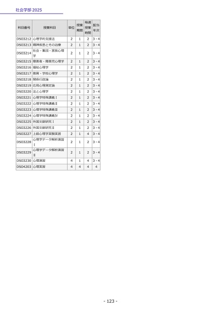 社会学部2025科目番号授業科目DSO3212心理学的支援法DSO3213DSO3214DSO3215精神疾患とその治療社会・集団・家族心理学障害者・障害児心理学DSO3216福祉心理学DSO3217教育・学校心理学DSO3218関係行政論DSO3219応用心理測定論DSO3220法と心理学DSO3221心理学特殊講義ⅠDSO3222心理学特殊講義ⅡDSO3223心理学特殊講義ⅢDSO3224心理学特殊講義ⅣDSO3225外国文献研究ⅠDSO3226外国文献研究ⅡDSO3227DSO3228DSO3229DSO3230上級心理学実験実習心理学データ解析演習Ⅰ心理学データ解析演習Ⅱ心理演習DSO4203心理実習単位授業期間毎週授業時間222222222222222222441111111111111111111422222222222222242244配当年次3・43・43・43・43・43・43・43・43・43・43・43・43・43・43・43・43・43・43・44-123-