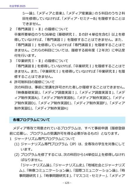 社会学部2025シー論」、「メディアと音楽」、「メディア産業論」の5科目のうち2科目を修得していなければ、「メディア・セミナーB」を履修することはできません。2「専門演習Ⅰ・Ⅱ」の履修について卒業所要単位のうち36単位(基礎研究Ⅰ、Ⅱの計4単位を含む)以上を修得していなければ、「専門演習Ⅰ」を履修することはできません。また、「専門演習Ⅰ」を修得していなければ「専門演習Ⅱ」を履修することはできません。これらの科目については、履修する前年度(2年次)に申込受付を行います。3「卒業研究Ⅰ・Ⅱ」の履修について「専門演習Ⅱ」を修得していなければ、「卒業研究Ⅰ」を履修することはできません。また、「卒業研究Ⅰ」を修得していなければ「卒業研究Ⅱ」を履修することはできません。4許可制科目の履修について次の科目は、事前に受講を許可された者しか履修することはできません。「映像基礎実習」、「メディア調査実習Ⅰ」、「メディア調査実習Ⅱ」、「メディア制作実習A」、「メディア制作実習B」、「メディア制作実習C」、「メディア制作実習D」、「メディア制作実習E」、「メディア制作実習F」、「メディア制作実習G」、「メディア制作実習H」種プログラムについて各メディア専攻で用意されているプログラムは、すべて事前申請(履修登録前に応募し、プログラムの受講許可を得る必要があるもの)となります。1ジャーナリズム専門プログラムについて(1)ジャーナリズム専門プログラム(JP)は、全専攻の学生を対象にしています。(2)プログラムを修了するには、次の科目から14単位以上を修得しなければなりません。「ジャーナリズム論」、「ジャーナリズム史」、「地域社会とジャーナリズム」、「映像コミュニケーション論」、「国際コミュニケーション論」、「時事問題研究Ⅰ」、「時事問題研究Ⅱ」、「マスコミ・セミナー」、「メディア-125-