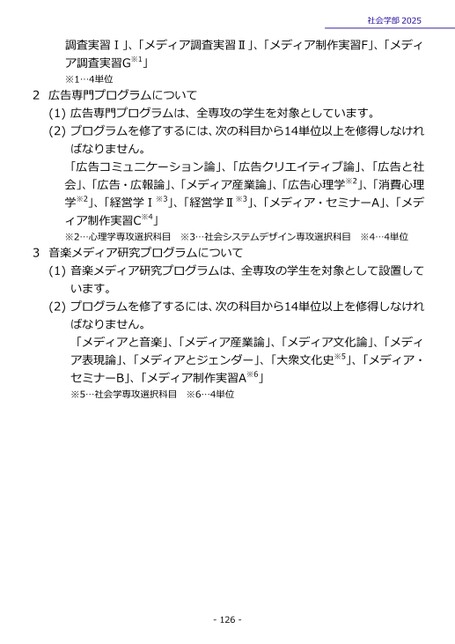 社会学部2025調査実習Ⅰ」、「メディア調査実習Ⅱ」、「メディア制作実習F」、「メディア調査実習G※1」※1…4単位2広告専門プログラムについて(1)広告専門プログラムは、全専攻の学生を対象としています。(2)プログラムを修了するには、次の科目から14単位以上を修得しなければなりません。「広告コミュニケーション論」、「広告クリエイティブ論」、「広告と社会」、「広告・広報論」、「メディア産業論」、「広告心理学※2」、「消費心理学※2」、「経営学Ⅰ※3」、「経営学Ⅱ※3」、「メディア・セミナーA」、「メディア制作実習C※4」※2…心理学専攻選択科目※3…社会システムデザイン専攻選択科目※4…4単位3音楽メディア研究プログラムについて(1)音楽メディア研究プログラムは、全専攻の学生を対象として設置しています。(2)プログラムを修了するには、次の科目から14単位以上を修得しなければなりません。「メディアと音楽」、「メディア産業論」、「メディア文化論」、「メディア表現論」、「メディアとジェンダー」、「大衆文化史※5」、「メディア・セミナーB」、「メディア制作実習A※6」※5…社会学専攻選択科目※6…4単位-126-