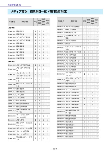 社会学部2025-127-メディア専攻授業科目一覧(専門教育科目)科目番号授業科目単位授業期間授業毎週時間配当年次必修科目DSO1301基礎研究Ⅰ2121DSO1302基礎研究Ⅱ2121DSO1303入門メディア研究Ⅰ2121DSO1304入門メディア研究Ⅱ2121DSO2301基礎演習Ⅰ2122DSO2302基礎演習Ⅱ2122DSO3301専門演習Ⅰ2123DSO3302専門演習Ⅱ2123DSO4301卒業研究Ⅰ2124DSO4302卒業研究Ⅱ2124選択科目DSO1305ン論映像コミュニケーション論ミュニケーション論インターネット・コメディア・リテラシーメディア研究方法論論国際コミュニケーショ基礎社会学Ⅰ2121DSO13062121DSO13072121DSO13082121DSO13092121DSO13102121DSO1311基礎社会学Ⅱ2121DSO1312入門心理学Ⅰ2121DSO1313入門心理学Ⅱ2121DSO1314映像基礎実習1121DSO1315情報処理基礎演習2121DSO1316コミュニケーション論世論とマス・コミュニメディア史ションの効果テーマ)寄附・連携講座(各情報処理演習Ⅰマス・コミュニケーケーション2121DSO13172121DSO23032122DSO23042122DSO23052122DSO23062122DSO2307ジャーナリズム論2122DSO2308地域社会とジャーナリジャーナリズム史ズム2122DSO23092122科目番号授業科目単位授業期間授業毎週時間配当年次DSO2310メディアの法と倫理2122DSO2311情報の法と倫理2122DSO2312社会デジタル・メディアと情報メディア論メディア産業論2122DSO23132122DSO23142122DSO2315ン論広告コミュニケーショ放送論広告クリエイティブ論2122DSO23162122DSO23172122DSO2318メディア文化論2122DSO2319メディアと音楽2122DSO2320メディアとスポーツ2122DSO2321メディアとジェンダー2122DSO2322メディア表現論2122DSO2323メディアと技術2122DSO2324スタディーズディーズフォトグラフィ・スタグローバル・メディア時事問題研究Ⅰ2122DSO23252122DSO23262122DSO2327時事問題研究Ⅱ2122DSO2328マスコミ・セミナー2122DSO2329メディア調査実習Ⅰ2142DSO2330メディア調査実習Ⅱ2142DSO2331メディア制作実習A4242DSO2332メディア制作実習B2142DSO2333メディア制作実習C4242DSO2334テーマ)専攻横断型講義(各メディア制作実習D情報処理演習Ⅱ2122DSO23332122DSO23342122DSO2335情報処理演習Ⅲ2122DSO2336差別と社会Ⅰ2122DSO2337差別と社会Ⅱ2122DSO2338社会学概論Ⅰ2122DSO2339社会学概論Ⅱ2122DSO2340経済原論Ⅰ2122DSO2341経済原論Ⅱ2122