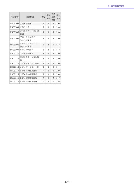 社会学部2025科目番号授業科目DSO3303広告・広報論DSO3304DSO3305DSO3307DSO3308DSO3309DSO3310DSO3311DSO3312広告と社会コミュニケーションと言語マス・コミュニケーション特論Aマス・コミュニケーション特論Bメディア特論Aメディア特論Bコミュニケーション特論メディア・セミナーADSO3313メディア・セミナーBDSO3314メディア制作実習EDSO3315メディア制作実習FDSO3316メディア制作実習GDSO3317メディア制作実習H単位授業期間毎週授業時間222222222242421111111111212122222222222242配当年次3・43・43・43・43・43・43・43・43・43・43・43・43・43・4-128-