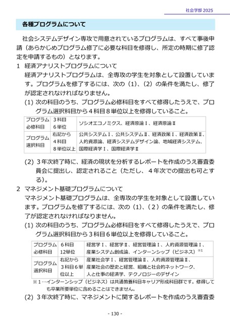 各種プログラムについて社会学部2025社会システムデザイン専攻で用意されているプログラムは、すべて事後申請(あらかじめプログラム修了に必要な科目を修得し、所定の時期に修了認定を申請するもの)となります。1経済アナリストプログラムについて経済アナリストプログラムは、全専攻の学生を対象として設置しています。プログラムを修了するには、次の(1)、(2)の条件を満たし、修了が認定されなければなりません。(1)次の科目のうち、プログラム必修科目をすべて修得したうえで、プログラム選択科目から4科目8単位以上を修得していること。プログラム必修科目プログラム選択科目3科目6単位右記から4科目8単位以上ソシオエコノミクス、経済原論Ⅰ、経済原論Ⅱ公共システムⅠ、公共システムⅡ、経済政策Ⅰ、経済政策Ⅱ、人的資源論、経済システムデザイン論、地域経済システム、国際経済学Ⅰ、国際経済学Ⅱ(2)3年次終了時に、経済の現状を分析するレポートを作成のうえ審査委員会に提出し、認定されること(ただし、4年次での提出も可とする)。2マネジメント基礎プログラムについてマネジメント基礎プログラムは、全専攻の学生を対象として設置しています。プログラムを修了するには、次の(1)、(2)の条件を満たし、修了が認定されなければなりません。(1)次の科目のうち、プログラム必修科目をすべて修得したうえで、プログラム選択科目から3科目6単位以上を修得していること。プログラム必修科目経営学Ⅰ、経営学Ⅱ、経営管理論Ⅰ、人的資源管理論Ⅰ、産業システム創成論、インターンシップ(ビジネス)※1産業社会学Ⅰ、経営管理論Ⅱ、人的資源管理論Ⅱ、産業社会の歴史と経営、組織と社会的ネットワーク、人と仕事の経済学、テクノロジーのデザイン6科目12単位右記から3科目6単位以上プログラム選択科目※1…インターンシップ(ビジネス)は共通教養科目キャリア形成科目群です。修得しても卒業所要単位に含めることはできません。(2)3年次終了時に、マネジメントに関するレポートを作成のうえ審査委-130-