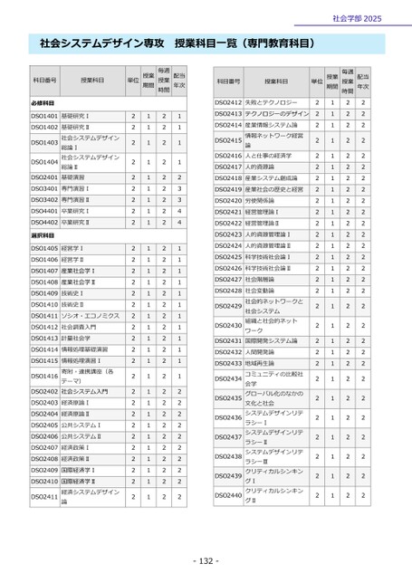 -132-社会学部2025社会システムデザイン専攻授業科目一覧(専門教育科目)科目番号授業科目単位授業期間授業毎週時間配当年次必修科目DSO1401基礎研究Ⅰ2121DSO1402総論Ⅱ総論Ⅰ社会システムデザイン基礎研究Ⅱ社会システムデザイン基礎演習2121DSO14032121DSO14042121DSO24012122DSO3401専門演習Ⅰ2123DSO3402専門演習Ⅱ2123DSO4401卒業研究Ⅰ2124DSO4402卒業研究Ⅱ2124選択科目DSO1405経営学Ⅰ2121DSO1406経営学Ⅱ2121DSO1407産業社会学Ⅰ2121DSO1408産業社会学Ⅱ2121DSO1409技術史Ⅰ2121DSO1410技術史Ⅱ2121DSO1411ソシオ・エコノミクス2121DSO1412社会調査入門2121DSO1413計量社会学2121DSO1414情報処理基礎演習2121DSO1415テーマ)寄附・連携講座(各情報処理演習Ⅰ社会システム入門2121DSO14162121DSO24022122DSO2403経済原論Ⅰ2122DSO2404経済原論Ⅱ2122DSO2405公共システムⅠ2122DSO2406公共システムⅡ2122DSO2407経済政策Ⅰ2122DSO2408経済政策Ⅱ2122DSO2409国際経済学Ⅰ2122DSO2410経済システムデザイン国際経済学Ⅱ論2122DSO24112122科目番号授業科目単位授業期間授業毎週時間配当年次DSO2412失敗とテクノロジー2122DSO2413テクノロジーのデザイン2122DSO2414論情報ネットワーク経営産業情報システム論人と仕事の経済学2122DSO24152122DSO24162122DSO2417人的資源論2122DSO2418産業システム創成論2122DSO2419産業社会の歴史と経営2122DSO2420労使関係論2122DSO2421経営管理論Ⅰ2122DSO2422経営管理論Ⅱ2122DSO2423人的資源管理論Ⅰ2122DSO2424人的資源管理論Ⅱ2122DSO2425科学技術社会論Ⅰ2122DSO2426科学技術社会論Ⅱ2122DSO2427社会階層論2122DSO2428国際開発システム論組織と社会的ネット社会システム社会的ネットワークと社会変動論ワーク2122DSO24292122DSO24302122DSO24312122DSO2432人間開発論2122DSO2433クリティカルシンキングⅠラシーⅢシステムデザインリテラシーⅡラシーⅠシステムデザインリテグローバル化のなかの会学コミュニティの比較社地域再生論文化と社会システムデザインリテクリティカルシンキングⅡ2122DSO24342122DSO24352122DSO24362122DSO24372122DSO24382122DSO24392122DSO24402122