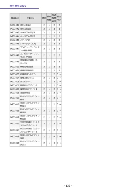 社会学部2025科目番号授業科目DSO2441差別と社会ⅠDSO2442差別と社会ⅡDSO2443キャリア心理学ⅠDSO2444キャリア心理学ⅡDSO2445メディア史DSO2446DSO2447DSO2448DSO2449DSO2450ジャーナリズム史コンピュータ・コンテンツ制作演習コンピュータ・プログラミング演習専攻横断型講義(各テーマ)情報処理演習ⅡDSO2451情報処理演習ⅢDSO3403地域経済システムDSO3404環境とビジネスDSO3405法とビジネスDSO3406環境社会デザインⅠDSO3407環境社会デザインⅡDSO3408DSO3409DSO3410DSO3411DSO3412DSO3413DSO3414DSO3415DSO3416社会保障論社会システムデザイン特論Ⅰ社会システムデザイン特論Ⅱ社会システムデザイン特論Ⅲ社会システムデザイン特論Ⅳ外国文献講読(社会システムデザイン)Ⅰ外国文献講読(社会システムデザイン)Ⅱ社会システムデザイン実習Ⅰ社会システムデザイン実習Ⅱ単位授業期間毎週授業時間配当年次222222222222222222222222211111111111111111111111112222222222222222222222244222222222223・43・43・43・43・43・43・43・43・43・43・43・43・43・4-133-