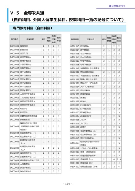 -134-社会学部2025(自由科目、外国人留学生科目、授業科目一覧の記号について)Ⅴ-5全専攻共通専門教育科目(自由科目)科目番号授業科目単位授業期間時間毎週授業配当年次DSO1001教職概説2121DSO1002教育原理2121DSO1003法学入門2121DSO1004倫理学概論a2121DSO1005倫理学概論b2121DSO1006宗教学概論a2121DSO1007宗教学概論b2121DSO1008日本史概説a2121DSO1009日本史概説b2121DSO1010東洋史概説a2121DSO1011東洋史概説b2121DSO1012西洋史概説a2121DSO1013西洋史概説b2121DSO1014人文地理学概説a2121DSO1015人文地理学概説b2121DSO1016自然地理学概説a2121DSO1017自然地理学概説b2121DSO1018地誌学a2121DSO1019地誌学b2121DSO1020図書館情報資源概論2121DSO2001社会科教育法(一)(情報通信技術の活用教育の方法及び技術教育制度論を含む)2122DSO20022122DSO20032122DSO2004(二)地理歴史科教育法地理歴史科教育法社会科教育法(二)(一)公民科教育法(一)2122DSO20052122DSO20062122DSO20072122DSO2008公民科教育法(二)2122DSO2009道徳教育の理論と方法2122DSO2010人権教育論2122DSO2011政治学原論12122DSO2012政治学原論22122科目番号授業科目単位授業期間時間毎週授業配当年次DSO2013哲学概論a2122DSO2014哲学概論b2122DSO2015考古学概説a2122DSO2016考古学概説b2122DSO2017地理学概説a2122DSO2018地理学概説b2122DSO2019学校経営と学校図書館2122DSO2020情報資源組織論2122DSO2021学習指導と学校図書館2122DSO2022読書と豊かな人間性2122DSO2023情報メディアの活用2122DSO2024メディア教育論2122DSO2025特別活動論2122DSO2026教育相談論2122DSO2027東洋史2122DSO2028西洋史2122DSO3001日本経済史Ⅰ2123DSO3002日本経済史Ⅱ2123DSO3003西洋経済史Ⅰ2123DSO3004西洋経済史Ⅱ2123DSO3005人口学Ⅰ2123DSO3006人口学Ⅱ2123DSO3007商業史2123DSO3008社会科教育法(三)2123DSO3009社会科教育法(四)2123DSO3010指導法特別支援教育論総合的な学習の時間のカリキュラム開発論1123DSO30111123DSO30122123DSO3013生徒・進路指導論2123DSO3014教育実習事前指導1123DSO3015教育実習(一)2143・4DSO4001教育実習(二)2144DSO4002教職実践演習(中等)2124