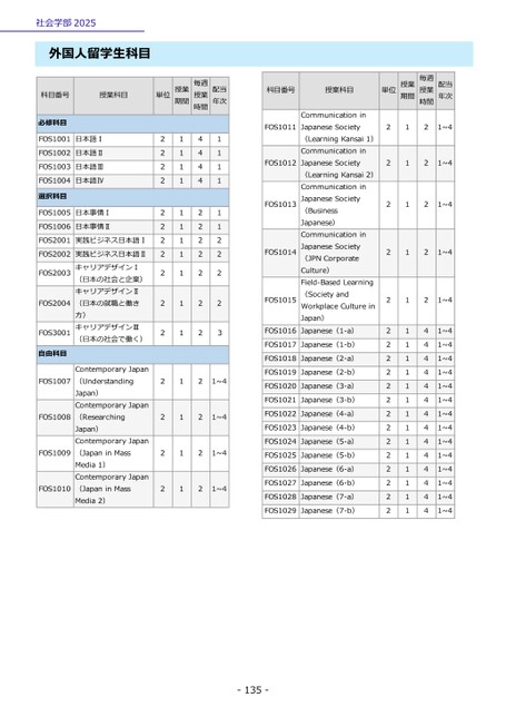 科目番号授業科目FOS1011FOS1012FOS1013FOS1014FOS1015FOS1016CommunicationinJapaneseSociety(LearningKansai1)CommunicationinJapaneseSociety(LearningKansai2)CommunicationinJapaneseSociety(BusinessJapanese)CommunicationinJapaneseSociety(JPNCorporateCulture)Field-BasedLearning(SocietyandWorkplaceCultureinJapan)Japanese(1-a)FOS1017Japanese(1-b)FOS1018Japanese(2-a)FOS1019Japanese(2-b)FOS1020Japanese(3-a)FOS1021Japanese(3-b)FOS1022Japanese(4-a)FOS1023Japanese(4-b)FOS1024Japanese(5-a)FOS1025Japanese(5-b)FOS1026Japanese(6-a)FOS1027Japanese(6-b)FOS1028Japanese(7-a)FOS1029Japanese(7-b)単位授業期間222111毎週授業時間配当年次21~421~421~42121~42222222222222221111111111111112444444444444441~41~41~41~41~41~41~41~41~41~41~41~41~41~41~4-135-社会学部2025外国人留学生科目科目番号授業科目単位授業期間毎週授業時間配当年次必修科目FOS1001日本語ⅠFOS1002日本語ⅡFOS1003日本語ⅢFOS1004日本語Ⅳ選択科目FOS1005日本事情ⅠFOS1006日本事情ⅡFOS2001実践ビジネス日本語ⅠFOS2002FOS2003FOS2004FOS3001自由科目FOS1007FOS1008FOS1009FOS1010実践ビジネス日本語ⅡキャリアデザインⅠ(日本の社会と企業)キャリアデザインⅡ(日本の就職と働き方)キャリアデザインⅢ(日本の社会で働く)ContemporaryJapan(UnderstandingJapan)ContemporaryJapan(ResearchingJapan)ContemporaryJapan(JapaninMassMedia1)ContemporaryJapan(JapaninMassMedia2)222222222222222111111111111111444422222221111112222321~421~421~421~4