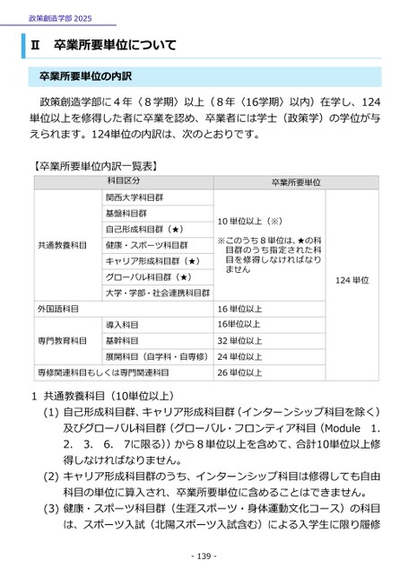 政策創造学部2025Ⅱ卒業所要単位について卒業所要単位の内訳政策創造学部に4年〈8学期〉以上(8年〈16学期〉以内)在学し、124単位以上を修得した者に卒業を認め、卒業者には学士(政策学)の学位が与えられます。124単位の内訳は、次のとおりです。卒業所要単位10単位以上(※)※このうち8単位は、★の科目群のうち指定された科目を修得しなければなりません124単位16単位以上16単位以上32単位以上24単位以上26単位以上関西大学科目群基盤科目群自己形成科目群(★)健康・スポーツ科目群キャリア形成科目群(★)グローバル科目群(★)大学・学部・社会連携科目群導入科目基幹科目展開科目(自学科・自専修)共通教養科目外国語科目専門教育科目専修関連科目もしくは専門関連科目1共通教養科目(10単位以上)卒業所要単位内訳一覧表】科目区分【(1)自己形成科目群、キャリア形成科目群(インターンシップ科目を除く)及びグローバル科目群(グローバル・フロンティア科目(Module1.2.3.6.7に限る))から8単位以上を含めて、合計10単位以上修得しなければなりません。(2)キャリア形成科目群のうち、インターンシップ科目は修得しても自由科目の単位に算入され、卒業所要単位に含めることはできません。(3)健康・スポーツ科目群(生涯スポーツ・身体運動文化コース)の科目は、スポーツ入試(北陽スポーツ入試含む)による入学生に限り履修-139-