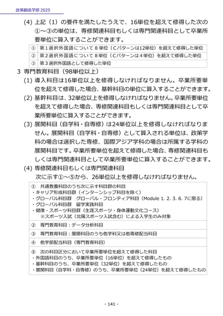 政策創造学部2025(4)上記(1)の要件を満たしたうえで、16単位を超えて修得した次の①~③の単位は、専修関連科目もしくは専門関連科目として卒業所要単位に算入することができます。①②③第1選択外国語について8単位(Cパターンは12単位)を超えて修得した単位第2選択外国語について8単位(Cパターンは4単位)を超えて修得した単位第3選択外国語として修得した単位3専門教育科目(98単位以上)(1)導入科目は16単位以上を修得しなければなりません。卒業所要単位を超えて修得した場合、基幹科目の単位に算入することができます。(2)基幹科目は、32単位以上を修得しなければなりません。卒業所要単位を超えて修得した場合、専修関連科目もしくは専門関連科目として卒業所要単位に算入することができます。(3)展開科目(自学科・自専修)は24単位以上を修得しなければなりません。展開科目(自学科・自専修)として算入される単位は、政策学科の場合は選択した専修、国際アジア学科の場合は所属する学科の展開科目です。卒業所要単位を超えて修得した場合、専修関連科目もしくは専門関連科目として卒業所要単位に算入することができます。(4)専修関連科目もしくは専門関連科目次に示す①~⑤から、26単位以上を修得しなければなりません。共通教養科目のうち次に示す科目群の科目①・キャリア形成科目群(インターンシップ科目を除く)・グローバル科目群グローバル・フロンティア科目(Module1.2.3.6.7に限る)・グローバル科目群留学実践科目・健康・スポーツ科目群(生涯スポーツ・身体運動文化コース)※スポーツ入試(北陽スポーツ入試含む)による入学生のみ対象専門教育科目:データ分析科目専門教育科目:展開科目のうち他学科又は他専修配当科目他学部配当科目(専門教育科目)②③④次の科目区分において卒業所要単位を超えて修得した科目⑤・外国語科目のうち、卒業所要単位(16単位)を超えて修得したもの・基幹科目のうち、卒業所要単位(32単位)を超えて修得したもの・展開科目(自学科・自専修)のうち、卒業所要単位(24単位)を超えて修得したもの-141-