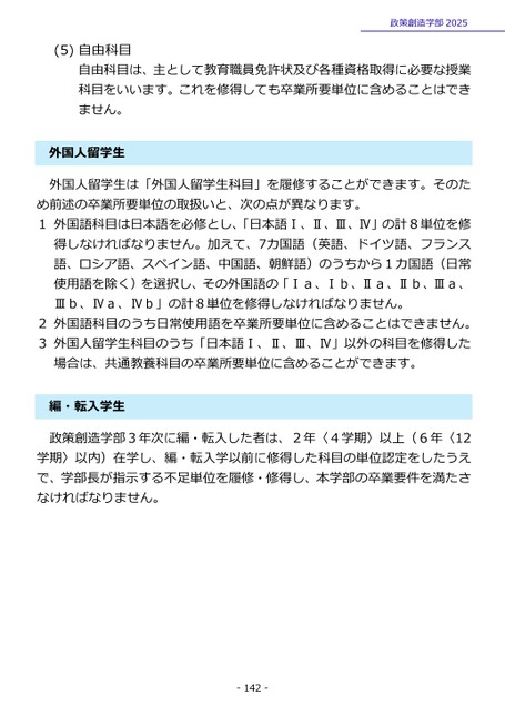 (5)自由科目政策創造学部2025自由科目は、主として教育職員免許状及び各種資格取得に必要な授業科目をいいます。これを修得しても卒業所要単位に含めることはできません。国人留学生外外国人留学生は「外国人留学生科目」を履修することができます。そのため前述の卒業所要単位の取扱いと、次の点が異なります。1外国語科目は日本語を必修とし、「日本語Ⅰ、Ⅱ、Ⅲ、Ⅳ」の計8単位を修得しなければなりません。加えて、7カ国語(英語、ドイツ語、フランス語、ロシア語、スペイン語、中国語、朝鮮語)のうちから1カ国語(日常使用語を除く)を選択し、その外国語の「Ⅰa、Ⅰb、Ⅱa、Ⅱb、Ⅲa、Ⅲb、Ⅳa、Ⅳb」の計8単位を修得しなければなりません。2外国語科目のうち日常使用語を卒業所要単位に含めることはできません。3外国人留学生科目のうち「日本語Ⅰ、Ⅱ、Ⅲ、Ⅳ」以外の科目を修得した場合は、共通教養科目の卒業所要単位に含めることができます。・転入学生編政策創造学部3年次に編・転入した者は、2年〈4学期〉以上(6年〈12学期〉以内)在学し、編・転入学以前に修得した科目の単位認定をしたうえで、学部長が指示する不足単位を履修・修得し、本学部の卒業要件を満たさなければなりません。-142-