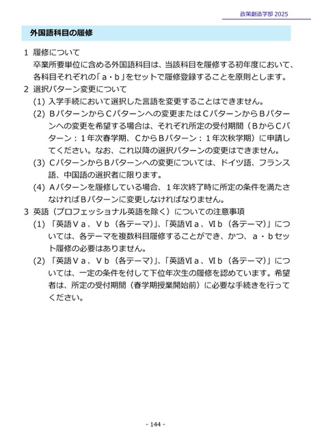 外国語科目の履修1履修について政策創造学部2025卒業所要単位に含める外国語科目は、当該科目を履修する初年度において、各科目それぞれの「a・b」をセットで履修登録することを原則とします。2選択パターン変更について(1)入学手続において選択した言語を変更することはできません。(2)BパターンからCパターンへの変更またはCパターンからBパターンへの変更を希望する場合は、それぞれ所定の受付期間(BからCパターン:1年次春学期、CからBパターン:1年次秋学期)に申請してください。なお、これ以降の選択パターンの変更はできません。(3)CパターンからBパターンへの変更については、ドイツ語、フランス語、中国語の選択者に限ります。(4)Aパターンを履修している場合、1年次終了時に所定の条件を満たさなければBパターンに変更しなければなりません。3英語(プロフェッショナル英語を除く)についての注意事項(1)「英語Ⅴa、Ⅴb(各テーマ)」、「英語Ⅵa、Ⅵb(各テーマ)」については、各テーマを複数科目履修することができ、かつ、a・bセット履修の必要はありません。(2)「英語Ⅴa、Ⅴb(各テーマ)」、「英語Ⅵa、Ⅵb(各テーマ)」については、一定の条件を付して下位年次生の履修を認めています。希望者は、所定の受付期間(春学期授業開始前)に必要な手続きを行ってください。-144-