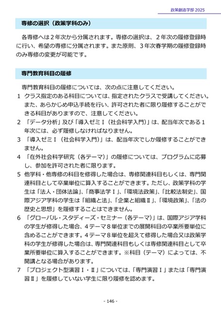 専修の選択(政策学科のみ)政策創造学部2025各専修へは2年次から分属されます。専修の選択は、2年次の履修登録時に行い、希望の専修に分属されます。また原則、3年次春学期の履修登録時のみ専修の変更が可能です。門教育科目の履修専専門教育科目の履修については、次の点に注意してください。1クラス指定のある科目については、指定されたクラスで受講してください。また、あらかじめ申込手続を行い、許可された者に限り履修することができる科目がありますので、注意してください。2「データ分析」及び「導入ゼミⅠ(社会科学入門)」は、配当年次である1年次には、必ず履修しなければなりません。3「導入ゼミⅠ(社会科学入門)」は、配当年次でしか履修することができません。4「在外社会科学研究(各テーマ)」の履修については、プログラムに応募し、参加を許可された者に限ります。5他学科・他専修の科目を修得した場合は、専修関連科目もしくは、専門関連科目として卒業単位に算入することができます。ただし、政策学科の学生は「法人・団体法論」、「商事法学Ⅰ」、「環境法政策」、「比較法制史」、国際アジア学科の学生は「組織と法」、「企業と組織Ⅱ」、「環境政策」、「法の歴史と思想」を履修することはできません。6「グローバル・スタディーズ・セミナー(各テーマ)」は、国際アジア学科の学生が修得した場合、4テーマ8単位までの展開科目の卒業所要単位に含めることができます。4テーマ8単位を超えて修得した場合又は政策学科の学生が修得した場合は、専門関連科目もしくは専修関連科目として卒業所要単位に算入することができます。※科目(テーマ)によっては、不開講となる場合があります。7「プロジェクト型演習Ⅰ・Ⅱ」については、「専門演習Ⅰ」または「専門演習Ⅱ」を履修していない学生に限り履修を認めます。-146-