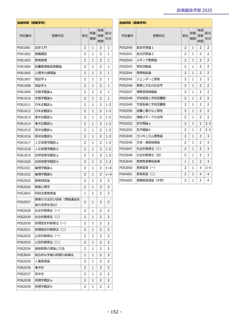 -152-政策創造学部2025自由科目(政策学科)科目番号授業科目単位授業期間授業毎週時間配当年次POS1001法学入門2121POS1002教職概説2121POS1003教育原理2121POS1004図書館情報資源概論2121POS1005心理学の諸理論2121POS1007地誌学a2121POS1008地誌学b2121POS1009宗教学概論a2121POS1010宗教学概論b2121POS1011日本史概説a2121・2POS1012日本史概説b2121・2POS1013東洋史概説a2121・2POS1014東洋史概説b2121・2POS1015西洋史概説a2121・2POS1016西洋史概説b2121・2POS1017人文地理学概説a2121・2POS1018人文地理学概説b2121・2POS1019自然地理学概説a2121・2POS1020自然地理学概説b2121・2POS1021倫理学概論a2121~4POS1022倫理学概論b2121~4POS2025教育制度論2122POS2026教育心理学2122POS3043社会科教育法(一)教育の方法及び技術(情報通信技特別支援教育論術の活用を含む)1123POS20272122POS20282122POS2029社会科教育法(二)2122POS2030地理歴史科教育法(一)2122POS2031地理歴史科教育法(二)2122POS2032公民科教育法(一)2122POS2033公民科教育法(二)2122POS2034道徳教育の理論と方法2122POS3044総合的な学習の時間の指導法1123POS2035人権教育論2122POS2036東洋史2122POS2037西洋史2122POS2038地理学概説a2122POS2039地理学概説b2122自由科目(政策学科)科目番号授業科目単位授業期間授業毎週時間配当年次POS2040政治学原論12122POS2041政治学原論22122POS2042メディア教育論2122POS2043特別活動論2122POS2044教育相談論2122POS2045ジェンダーと教育2122POS2046教育と文化の社会学2122POS2047情報資源組織論2122POS2048学校経営と学校図書館2122POS2049学習指導と学校図書館2122POS2050読書と豊かな人間性2122POS2051情報メディアの活用2122POS2052哲学概論a2122・3POS2053哲学概論b2122・3POS3045カリキュラム開発論2123POS3046生徒・進路指導論2123POS3047社会科教育法(三)2123POS3048社会科教育法(四)2123POS3049教育実習事前指導1123POS3050教育実習(一)2143・4POS4001教育実習(二)2144POS4002教職実践演習(中等)2124