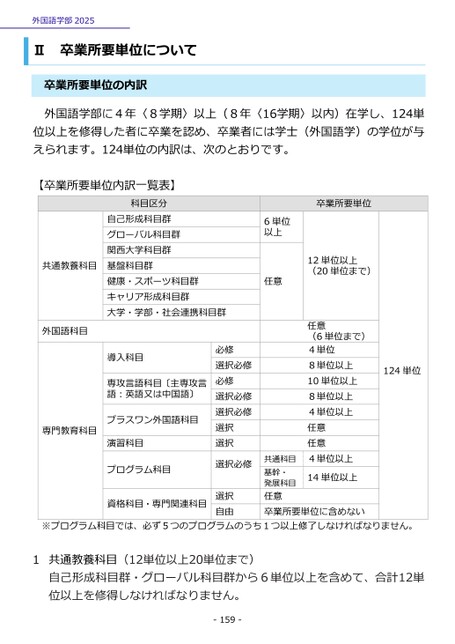 外国語学部2025Ⅱ卒業所要単位について卒業所要単位の内訳外国語学部に4年〈8学期〉以上(8年〈16学期〉以内)在学し、124単位以上を修得した者に卒業を認め、卒業者には学士(外国語学)の学位が与えられます。124単位の内訳は、次のとおりです。【卒業所要単位内訳一覧表】24単位1共通教養科目外国語科目専門教育科目科目区分自己形成科目群グローバル科目群関西大学科目群基盤科目群健康・スポーツ科目群キャリア形成科目群大学・学部・社会連携科目群導入科目専攻言語科目〔主専攻言語:英語又は中国語〕プラスワン外国語科目演習科目プログラム科目資格科目・専門関連科目必修選択必修必修選択必修選択必修選択選択選択必修選択自由6単位以上任意卒業所要単位12単位以上(20単位まで)任意(6単位まで)4単位8単位以上10単位以上8単位以上4単位以上任意任意4単位以上14単位以上共通科目基幹・発展科目任意卒業所要単位に含めない※プログラム科目では、必ず5つのプログラムのうち1つ以上修了しなければなりません。1共通教養科目(12単位以上20単位まで)自己形成科目群・グローバル科目群から6単位以上を含めて、合計12単位以上を修得しなければなりません。-159-
