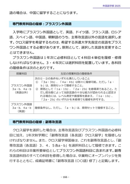 外国語学部2025語の場合は、中国に留学することになります。門教育科目の履修:プラスワン外国語専入学時にプラスワン外国語として、英語、ドイツ語、フランス語、ロシア語、スペイン語、中国語、朝鮮語のうち、主専攻言語以外の言語を選択します。クロス留学を希望するものは、希望する派遣大学先指定の言語をプラスワン外国語とする必要があります。原則として、選択した言語を変更することはできません。プラスワン外国語は1年次に必修科目として4科目4単位を履修・修得しなければなりません。3・4年次には選択科目を配置しています。各科目の履修条件は次のとおりです。授業科目左記の授業科目の履修条件次の①・②の条件をいずれも満たしていること①「3a・3b」、「4a・4b」は別々に履修可能。ただし「a・b」は、原則セットで履修すること。②原則として「1a・1b」、「2a・2b」を修得済であること。ただし担当者によって当該言語の十分な能力が認められると認定される場合には、レベル測定や面接等を踏まえ、「1a・1b」、「2a・2b」のいずれかを未修得でも履修を許可する。履修条件なし。ただし、「a・b」は、原則セットで履修すること。プラスワン外国語3a・b、4a・b(英語以外)プラスワン外国語3a・b、4a・b(英語)クロス留学を選択した場合は、主専攻言語及びプラスワン外国語の必修科目に加え、1年次秋学期に「副専攻言語(各言語)クロス留学」を履修しなければなりません。また、クロス留学帰国後は、これを副専攻言語とし、「副専攻言語(各言語)3、4、5各a・b」を選択科目として履修できます。これらの科目は卒業所要単位としてプラスワン外国語科目に含まれます。副専攻言語科目のすべての科目を修得した場合は、卒業時にオープンバッジを発行するとともに、成績証明書に「副専攻言語(〇〇語)修了」と記載します。門教育科目の履修:副専攻言語専-166-