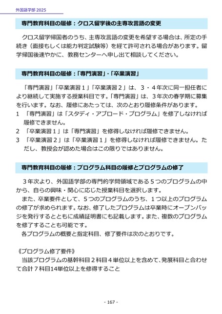 クロス留学帰国者のうち、主専攻言語の変更を希望する場合は、所定の手続き(面接もしくは能力判定試験等)を経て許可される場合があります。留学帰国後速やかに、教務センターへ申し出て相談してください。門教育科目の履修:「専門演習」・「卒業演習」専「専門演習」「卒業演習1」「卒業演習2」は、3・4年次に同一担任者により継続して実施する授業科目です。「専門演習」は、3年次の春学期に募集を行います。なお、履修にあたっては、次のとおり履修条件があります。1「専門演習」は「スタディ・アブロード・プログラム」を修了しなければ履修できません。2「卒業演習1」は「専門演習」を修得しなければ履修できません。3「卒業演習2」は「卒業演習1」を修得しなければ履修できません。ただし、教授会が認めた場合はこの限りではありません。専門教育科目の履修:クロス留学後の主専攻言語の変更門教育科目の履修:プログラム科目の履修とプログラムの修了専3年次より、外国語学部の専門的学問領域である5つのプログラムの中から、自らの興味・関心に応じた授業科目を選択します。また、卒業要件として、5つのプログラムのうち、1つ以上のプログラムの修了が求められます。なお、修了したプログラムは卒業時にオープンバッジを発行するとともに成績証明書にも記載します。また、複数のプログラムを修了することも可能です。各プログラムの概要と指定科目、修了要件は次のとおりです。プログラム修了要件》当該プログラムの基幹科目2科目4単位以上を含めて、発展科目と合わせ《て合計7科目14単位以上を修得すること外国語学部2025-167-
