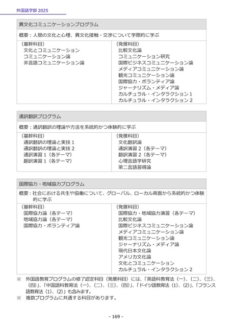 外国語学部2025異文化コミュニケーションプログラム概要:人間の文化と心理、異文化接触・交渉について学際的に学ぶ(基幹科目)文化とコミュニケーションコミュニケーション論非言語コミュニケーション論(発展科目)比較文化論コミュニケーション研究国際ビジネスコミュニケーション論メディアコミュニケーション論観光コミュニケーション論国際協力・ボランティア論ジャーナリズム・メディア論カルチュラル・インタラクション1カルチュラル・インタラクション2通訳翻訳プログラム概要:通訳翻訳の理論や方法を系統的かつ体験的に学ぶ(基幹科目)通訳翻訳の理論と実技1通訳翻訳の理論と実技2通訳演習1(各テーマ)翻訳演習1(各テーマ)(発展科目)文化翻訳論通訳演習2(各テーマ)翻訳演習2(各テーマ)心理言語学研究第二言語習得論国際協力・地域協力プログラム概要:社会における共生や協働について、グローバル、ローカル両面から系統的かつ体験的に学ぶ(基幹科目)国際協力論(各テーマ)地域協力論(各テーマ)国際協力・ボランティア論(発展科目)国際協力・地域協力演習(各テーマ)比較文化論国際ビジネスコミュニケーション論メディアコミュニケーション論観光コミュニケーション論ジャーナリズム・メディア論現代日本文化論アメリカ文化論文化とコミュニケーションカルチュラル・インタラクション2外国語教育プログラムの修了認定科目(発展科目)には、「英語科教育法(一)、(二)、(三)、(四)」、「中国語科教育法(一)、(二)、(三)、(四)」、「ドイツ語教育法(1)、(2)」、「フランス語教育法(1)、(2)」も含みます。複数プログラムに共通する科目があります。-169-※※