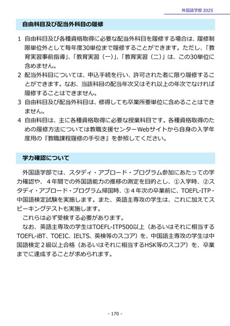 自由科目及び配当外科目の履修外国語学部20251自由科目及び各種資格取得に必要な配当外科目を履修する場合は、履修制限単位外として毎年度30単位まで履修することができます。ただし、「教育実習事前指導」、「教育実習(一)」、「教育実習(二)」は、この30単位に含めません。2配当外科目については、申込手続を行い、許可された者に限り履修することができます。なお、当該科目の配当年次又はそれ以上の年次でなければ履修することはできません。3自由科目及び配当外科目は、修得しても卒業所要単位に含めることはできません。4自由科目は、主に各種資格取得に必要な授業科目です。各種資格取得のための履修方法については教職支援センターWebサイトから自身の入学年度用の『教職課程履修の手引き』を参照してください。力確認について学外国語学部では、スタディ・アブロード・プログラム参加にあたっての学力確認や、4年間での外国語能力の推移の測定を目的とし、①入学時、②スタディ・アブロード・プログラム帰国時、③4年次の卒業前に、TOEFL-ITP・中国語検定試験を実施します。また、英語主専攻の学生は、これに加えてスピーキングテストも実施します。これらは必ず受検する必要があります。なお、英語主専攻の学生はTOEFL-ITP500以上(あるいはそれに相当するTOEFL-iBT、TOEIC、IELTS、英検等のスコア)を、中国語主専攻の学生は中国語検定2級以上合格(あるいはそれに相当するHSK等のスコア)を、卒業までに達成することが求められます。-170-