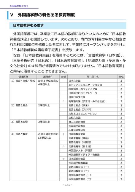 外国語学部2025Ⅴ外国語学部の特色ある教育制度日本語教師をめざす外国語学部では、卒業後に日本語の教師になりたい人のために「日本語教師養成講座」を開設しています。次のとおり、専門教育科目の中から指定された科目28単位を修得した者に対して、卒業時にオープンバッジを発行し、「日本語教師養成講座修了証書」を授与します。なお、「日本語教育実習」を履修するためには、「言語教育学(日本語)」、「言語分析研究(日本語)」、「日本語教育演習」、「地域協力論(多言語・多文化社会)」の4科目が修得済みでなければなりません。「日本語教育実習」と同時に履修することはできません。必修☆☆☆☆科目名単位日本文化論メディアコミュニケーション論国際協力・ボランティア論日本語プロジェクトワーク現代日本文化論地域協力論(多言語・多文化社会)言語と社会(欧米)言語と社会(アジア)文化とコミュニケーション比較文化論第二言語習得論外国語学習者論心理言語学研究日本語教育実習言語教育学(英語)言語教育学(中国語)言語教育学(日本語)外国語テスト・評価論外国語教育メディア・教材論日本語教育演習外国語早期教育論英語科教育法(一)英語科教育法(二)中国語科教育法(一)中国語科教育法(二)2222222222222222222222222領域区分履修条件必修2単位を含む4単位以上1)社会・文化・地域必修6単位を含む12単位以上2単位以上3)言語と心理4)言語と教育2)言語と社会2単位以上-171-