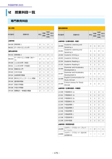 外国語学部2025Ⅵ授業科目一覧専門教育科目導入科目専攻言語科目科目番号授業科目必修科目BA100基礎演習1BA101データサイエンス入門選択必修科目BA102BA103SP100基礎演習2データサイエンス発展(各テーマ)ことばの世界(英語)SP101ことばの世界(中国語)SP102地域文化入門SP103日本文化論SP104言語教育学概論SP105異文化コミュニケーション概論SP106通訳翻訳概論SP107英語文学概論SP108中国文学概論SP109国際協力・地域協力概論単位授業期間毎週授業時間配当年次科目番号授業科目単位授業期間毎週授業時間配当年次22222222222222111111111111112222222222222211111111111111必修科目〔主専攻言語:英語〕LE100LE101LE102AcademicListeningandSpeakingaAcademicListeningandSpeakingbAcademicWritingaLE103AcademicWritingbLE104AcademicReadingaLE105LE106LE107LE108LE109AcademicReadingbGrammarandVocabularyDevelopmentaGrammarandVocabularyDevelopmentbEnglishCommunicationforStudyAbroadCriticalLiteracyforStudyAbroad必修科目〔主専攻言語:中国語〕LC100中国語総合1aLC101中国語総合1bLC102中国語総合2aLC103中国語総合2bLC104中国語理解1LC105中国語理解2LC106中国語理解3LC107中国語表現1LC108中国語表現2LC109応用中国語必修科目〔両言語共通〕111111111111111111111111111111111111111122222222222222222222LA100LA200スタディ・アブロード・プレパレーションスタディ・アブロード(各大学)各授業科目ーー2ーーー1111111111111111111112-175-