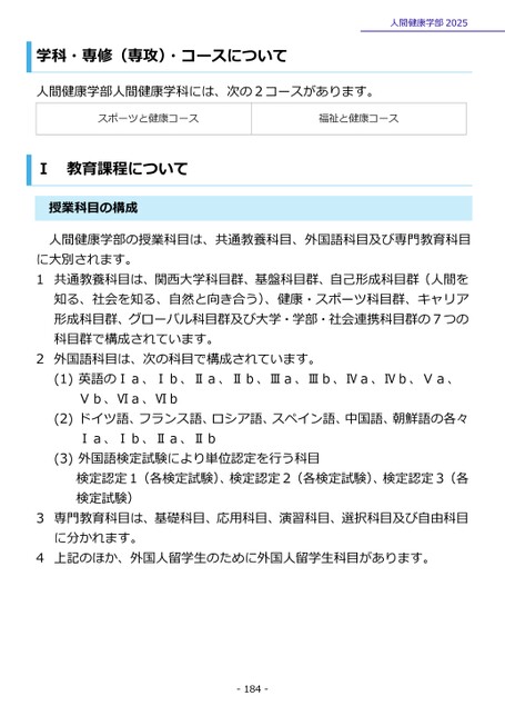 学科・専修(専攻)・コースについて人間健康学部2025人間健康学部人間健康学科には、次の2コースがあります。スポーツと健康コース福祉と健康コース教育課程についてⅠ授業科目の構成人間健康学部の授業科目は、共通教養科目、外国語科目及び専門教育科目に大別されます。1共通教養科目は、関西大学科目群、基盤科目群、自己形成科目群(人間を知る、社会を知る、自然と向き合う)、健康・スポーツ科目群、キャリア形成科目群、グローバル科目群及び大学・学部・社会連携科目群の7つの科目群で構成されています。2外国語科目は、次の科目で構成されています。(1)英語のⅠa、Ⅰb、Ⅱa、Ⅱb、Ⅲa、Ⅲb、Ⅳa、Ⅳb、Ⅴa、Ⅴb、Ⅵa、Ⅵb(2)ドイツ語、フランス語、ロシア語、スペイン語、中国語、朝鮮語の各々Ⅰa、Ⅰb、Ⅱa、Ⅱb(3)外国語検定試験により単位認定を行う科目検定認定1(各検定試験)、検定認定2(各検定試験)、検定認定3(各検定試験)3専門教育科目は、基礎科目、応用科目、演習科目、選択科目及び自由科目に分かれます。4上記のほか、外国人留学生のために外国人留学生科目があります。-184-