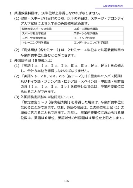 1共通教養科目は、16単位以上修得しなければなりません。人間健康学部2025(1)健康・スポーツ科目群のうち、以下の科目は、スポーツ・フロンティア入学試験による入学生のみ履修を認めます。関西大学スポーツ文化論スポーツ社会学概論スポーツ栄養学概論トレーニング科学概論スポーツ運動学概論スポーツ心理学概論コーチングの科学コンディショニング科学概論(2)「海外研修(各セミナー)」は、2セミナー4単位まで共通教養科目の卒業所要単位に含むことができます。2外国語科目(8単位以上)(1)「英語Ⅰa、Ⅰb、Ⅱa、Ⅱb、Ⅲa、Ⅲb、Ⅳa、Ⅳb」を必修とし、合計8単位を修得しなければなりません。(2)「英語Ⅴa、Ⅴb、Ⅵa、Ⅵb(各テーマ)」(千里山キャンパス開講)及びドイツ語・フランス語・ロシア語・スペイン語・中国語・朝鮮語の各「Ⅰa、Ⅰb、Ⅱa、Ⅱb」を修得した場合は、卒業所要単位に含めることができます。(3)外国語検定試験の単位認定について「検定認定1~3(各検定試験)」を修得した場合は、卒業所要単位に含めることができます。なお、英語の場合は、この単位を上記(1)の単位に代えることもできます。ただし、卒業所要単位に含められる単位数は、英語は6単位、英語以外の外国語は4単位を上限とします。-186-