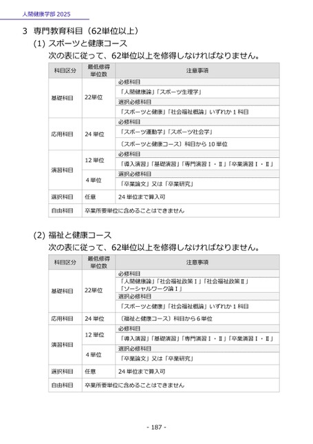 人間健康学部20253専門教育科目(62単位以上)(1)スポーツと健康コース次の表に従って、62単位以上を修得しなければなりません。科目区分最低修得単位数基礎科目22単位応用科目24単位演習科目12単位4単位注意事項必修科目「人間健康論」「スポーツ生理学」選択必修科目「スポーツと健康」「社会福祉概論」いずれか1科目必修科目「スポーツ運動学」「スポーツ社会学」〔スポーツと健康コース〕科目から10単位必修科目「導入演習」「基礎演習」「専門演習Ⅰ・Ⅱ」「卒業演習Ⅰ・Ⅱ」選択必修科目「卒業論文」又は「卒業研究」選択科目任意24単位まで算入可自由科目卒業所要単位に含めることはできません(2)福祉と健康コース次の表に従って、62単位以上を修得しなければなりません。科目区分最低修得単位数基礎科目22単位注意事項必修科目「人間健康論」「社会福祉政策Ⅰ」「社会福祉政策Ⅱ」「ソーシャルワーク論Ⅰ」選択必修科目「スポーツと健康」「社会福祉概論」いずれか1科目応用科目24単位演習科目12単位4単位〔福祉と健康コース〕科目から6単位必修科目「導入演習」「基礎演習」「専門演習Ⅰ・Ⅱ」「卒業演習Ⅰ・Ⅱ」選択必修科目「卒業論文」又は「卒業研究」選択科目任意24単位まで算入可自由科目卒業所要単位に含めることはできません-187-