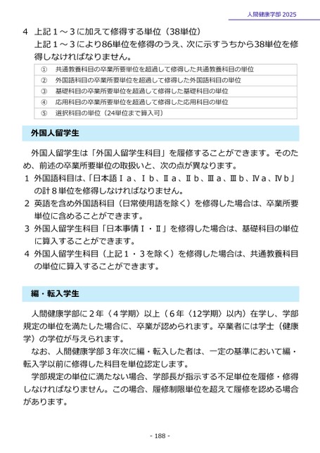 4上記1~3に加えて修得する単位(38単位)人間健康学部2025上記1~3により86単位を修得のうえ、次に示すうちから38単位を修得しなければなりません。①②③④⑤共通教養科目の卒業所要単位を超過して修得した共通教養科目の単位外国語科目の卒業所要単位を超過して修得した外国語科目の単位基礎科目の卒業所要単位を超過して修得した基礎科目の単位応用科目の卒業所要単位を超過して修得した応用科目の単位選択科目の単位(24単位まで算入可)外国人留学生外国人留学生は「外国人留学生科目」を履修することができます。そのため、前述の卒業所要単位の取扱いと、次の点が異なります。1外国語科目は、「日本語Ⅰa、Ⅰb、Ⅱa、Ⅱb、Ⅲa、Ⅲb、Ⅳa、Ⅳb」の計8単位を修得しなければなりません。2英語を含め外国語科目(日常使用語を除く)を修得した場合は、卒業所要単位に含めることができます。3外国人留学生科目「日本事情Ⅰ・Ⅱ」を修得した場合は、基礎科目の単位に算入することができます。4外国人留学生科目(上記1・3を除く)を修得した場合は、共通教養科目の単位に算入することができます。・転入学生編人間健康学部に2年〈4学期〉以上(6年〈12学期〉以内)在学し、学部規定の単位を満たした場合に、卒業が認められます。卒業者には学士(健康学)の学位が与えられます。なお、人間健康学部3年次に編・転入した者は、一定の基準において編・転入学以前に修得した科目を単位認定します。学部規定の単位に満たない場合、学部長が指示する不足単位を履修・修得しなければなりません。この場合、履修制限単位を超えて履修を認める場合があります。-188-