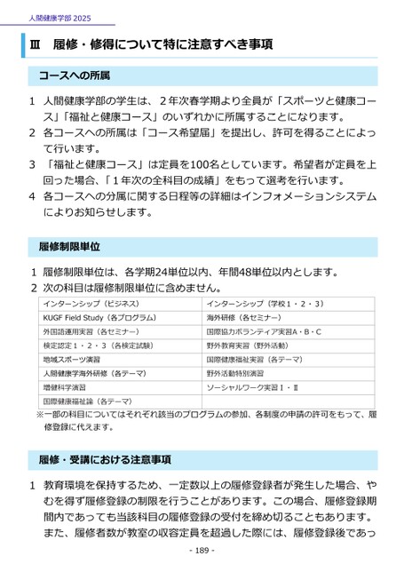人間健康学部2025Ⅲ履修・修得について特に注意すべき事項コースへの所属1人間健康学部の学生は、2年次春学期より全員が「スポーツと健康コース」「福祉と健康コース」のいずれかに所属することになります。2各コースヘの所属は「コース希望届」を提出し、許可を得ることによって行います。3「福祉と健康コース」は定員を100名としています。希望者が定員を上回った場合、「1年次の全科目の成績」をもって選考を行います。4各コースヘの分属に関する日程等の詳細はインフォメーションシステムによりお知らせします。修制限単位履1履修制限単位は、各学期24単位以内、年間48単位以内とします。2次の科目は履修制限単位に含めません。インターンシップ(ビジネス)KUGFFieldStudy(各プログラム)外国語運用実習(各セミナー)検定認定1・2・3(各検定試験)地域スポーツ演習人間健康学海外研修(各テーマ)増健科学演習国際健康福祉論(各テーマ)インターンシップ(学校1・2・3)海外研修(各セミナー)国際協力ボランティア実習A・B・C野外教育実習(野外活動)国際健康福祉実習(各テーマ)野外活動特別演習ソーシャルワーク実習Ⅰ・Ⅱ※一部の科目についてはそれぞれ該当のプログラムの参加、各制度の申請の許可をもって、履修・受講における注意事項履修登録に代えます。1教育環境を保持するため、一定数以上の履修登録者が発生した場合、やむを得ず履修登録の制限を行うことがあります。この場合、履修登録期間内であっても当該科目の履修登録の受付を締め切ることもあります。また、履修者数が教室の収容定員を超過した際には、履修登録後であっ-189-