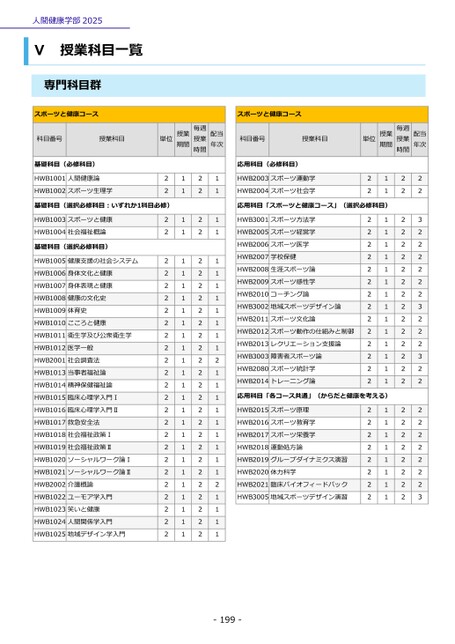 222222222222222222222222223222222322232222222223応用科目「スポーツと健康コース」(選択必修科目)HWB3001スポーツ方法学HWB2005スポーツ経営学HWB2006スポーツ医学HWB2007学校保健HWB2008生涯スポーツ論HWB2009スポーツ感性学HWB2010コーチング論HWB3002地域スポーツデザイン論HWB2011スポーツ文化論HWB2012スポーツ動作の仕組みと制御HWB2013レクリエーション支援論HWB3003障害者スポーツ論HWB2080スポーツ統計学HWB2014トレーニング論2222222222222211111111111111応用科目「各コース共通」(からだと健康を考える)HWB2015スポーツ原理HWB2016スポーツ教育学HWB2017スポーツ栄養学HWB2018運動処方論HWB2019グループダイナミクス演習HWB2020体力科学HWB2021臨床バイオフィードバックHWB3005地域スポーツデザイン演習2222222211111111111111111111111111111111111222222222222222222222222222111111111111211111111121111単位授業期間毎週授業時間配当年次22スポーツと健康コース科目番号授業科目応用科目(必修科目)HWB2003スポーツ運動学HWB2004スポーツ社会学単位授業期間毎週授業時間配当年次2211-199-人間健康学部2025Ⅴ授業科目一覧専門科目群スポーツと健康コース科目番号授業科目基礎科目(必修科目)HWB1001人間健康論HWB1002スポーツ生理学基礎科目(選択必修科目:いずれか1科目必修)HWB1003スポーツと健康HWB1004社会福祉概論基礎科目(選択必修科目)HWB1005健康支援の社会システムHWB1006身体文化と健康HWB1007身体表現と健康HWB1008健康の文化史HWB1009体育史HWB1010こころと健康HWB1011衛生学及び公衆衛生学HWB1012医学一般HWB2001社会調査法HWB1013当事者福祉論HWB1014精神保健福祉論HWB1015臨床心理学入門ⅠHWB1016臨床心理学入門ⅡHWB1017救急安全法HWB1018社会福祉政策ⅠHWB1019社会福祉政策ⅡHWB1020ソーシャルワーク論ⅠHWB1021ソーシャルワーク論ⅡHWB2002介護概論HWB1022ユーモア学入門HWB1023笑いと健康HWB1024人間関係学入門HWB1025地域デザイン学入門2222222222222222222222222