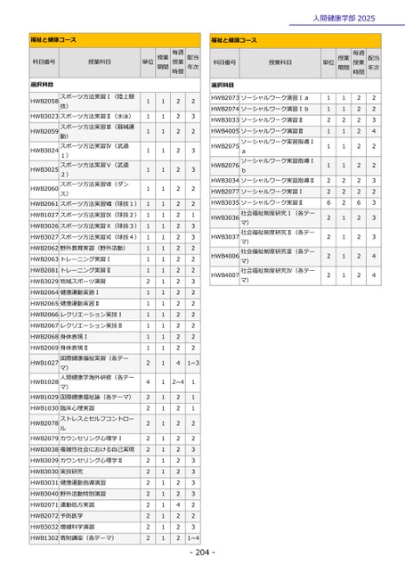 1121112262222112111222111122222222622222234223233344選択科目HWB2073ソーシャルワーク演習ⅠaHWB2074ソーシャルワーク演習ⅠbHWB3033ソーシャルワーク演習ⅡHWB4005ソーシャルワーク演習ⅢHWB2075HWB2076ソーシャルワーク実習指導Ⅰaソーシャルワーク実習指導ⅠbHWB3034ソーシャルワーク実習指導ⅡHWB2077ソーシャルワーク実習ⅠHWB3035ソーシャルワーク実習ⅡHWB3036HWB3037HWB4006HWB4007社会福祉制度研究Ⅰ(各テーマ)社会福祉制度研究Ⅱ(各テーマ)社会福祉制度研究Ⅲ(各テーマ)社会福祉制度研究Ⅳ(各テーマ)-204-単位授業期間毎週授業時間配当年次福祉と健康コース科目番号授業科目人間健康学部2025単位授業期間毎週授業時間配当年次福祉と健康コース科目番号授業科目選択科目HWB2058スポーツ方法実習Ⅰ(陸上競技)HWB3024HWB2059HWB3023スポーツ方法実習Ⅱ(水泳)スポーツ方法実習Ⅲ(器械運動)スポーツ方法実習Ⅳ(武道1)スポーツ方法実習Ⅴ(武道2)スポーツ方法実習Ⅶ(ダンス)HWB3025HWB2060HWB2061スポーツ方法実習Ⅷ(球技1)HWB1027スポーツ方法実習Ⅸ(球技2)HWB3026スポーツ方法実習Ⅹ(球技3)HWB3027スポーツ方法実習Ⅺ(球技4)HWB2062野外教育実習(野外活動)HWB2063トレーニング実習ⅠHWB2081トレーニング実習ⅡHWB3029地域スポーツ演習HWB2064健康運動実習ⅠHWB2065健康運動実習ⅡHWB2066レクリエーション実技ⅠHWB2067レクリエーション実技ⅡHWB2068身体表現ⅠHWB2069身体表現ⅡHWB1027HWB1028国際健康福祉実習(各テーマ)人間健康学海外研修(各テーマ)HWB1029国際健康福祉論(各テーマ)HWB1030臨床心理実習HWB2078ストレスとセルフコントロールHWB2079カウンセリング心理学ⅠHWB3038複雑性社会における自己実現HWB3039カウンセリング心理学ⅡHWB3030実技研究HWB3031健康運動指導演習HWB3040野外活動特別演習HWB2071運動処方実習HWB2072予防医学HWB3032増健科学演習HWB1302寄附講座(各テーマ)11111111111112111111242222222222222111111111111111111111111111111111112222222222222222222242~42222222224222232332213322232222221~311122333332231~4