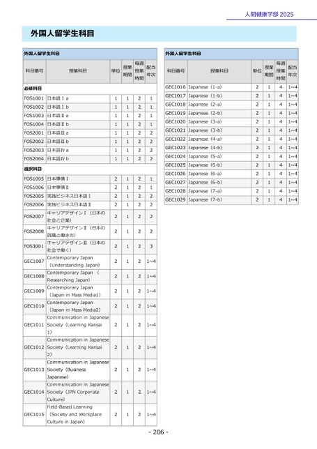 人間健康学部2025単位授業期間毎週授業時間222222222222221111111111111144444444444444配当年次1~41~41~41~41~41~41~41~41~41~41~41~41~41~4科目番号授業科目GEC1016Japanese(1-a)GEC1017Japanese(1-b)GEC1018Japanese(2-a)GEC1019Japanese(2-b)GEC1020Japanese(3-a)GEC1021Japanese(3-b)GEC1022Japanese(4-a)GEC1023Japanese(4-b)GEC1024Japanese(5-a)GEC1025Japanese(5-b)GEC1026Japanese(6-a)GEC1027Japanese(6-b)GEC1028Japanese(7-a)GEC1029Japanese(7-b)-206-外国人留学生科目外国人留学生科目外国人留学生科目科目番号授業科目単位授業期間毎週授業時間配当年次必修科目FOS1001日本語ⅠaFOS1002日本語ⅠbFOS1003日本語ⅡaFOS1004日本語ⅡbFOS2001日本語ⅢaFOS2002日本語ⅢbFOS2003日本語ⅣaFOS2004日本語Ⅳb選択科目FOS1005日本事情ⅠFOS1006日本事情ⅡFOS2005実践ビジネス日本語ⅠFOS2006FOS2007FOS2008FOS3001GEC1007GEC1008GEC1009GEC1010GEC1011GEC1012GEC1013GEC1014GEC1015実践ビジネス日本語ⅡキャリアデザインⅠ(日本の社会と企業)キャリアデザインⅡ(日本の就職と働き方)キャリアデザインⅢ(日本の社会で働く)ContemporaryJapan(UnderstandingJapan)ContemporaryJapan(ResearchingJapan)ContemporaryJapan(JapaninMassMedia1)ContemporaryJapan(JapaninMassMedia2)CommunicationinJapaneseSociety(LearningKansai1)CommunicationinJapaneseSociety(LearningKansai2)CommunicationinJapaneseSociety(BusinessJapanese)CommunicationinJapaneseSociety(JPNCorporateCulture)Field-BasedLearning(SocietyandWorkplaceCultureinJapan)111111112222222222222222111111111111111111111111222222222222222222221111222211222231~41~41~41~41~421~421~421~421~4