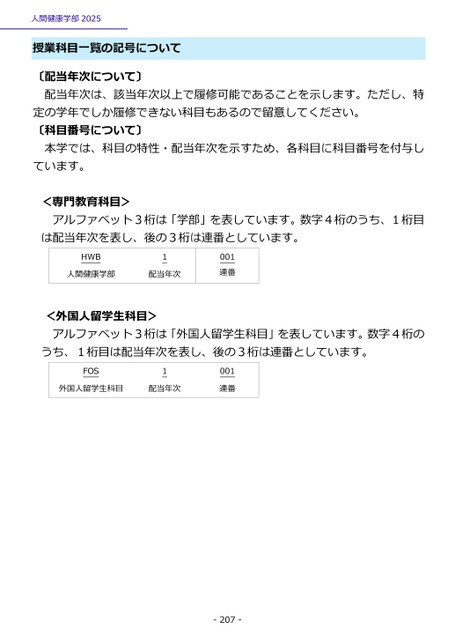 配当年次は、該当年次以上で履修可能であることを示します。ただし、特定の学年でしか履修できない科目もあるので留意してください。〔科目番号について〕ています。本学では、科目の特性・配当年次を示すため、各科目に科目番号を付与し専門教育科目>アルファベット3桁は「学部」を表しています。数字4桁のうち、1桁目<は配当年次を表し、後の3桁は連番としています。HWB1人間健康学部配当年次001連番外国人留学生科目>アルファベット3桁は「外国人留学生科目」を表しています。数字4桁の<うち、1桁目は配当年次を表し、後の3桁は連番としています。FOS1外国人留学生科目配当年次001連番人間健康学部2025授業科目一覧の記号について〔配当年次について〕-207-